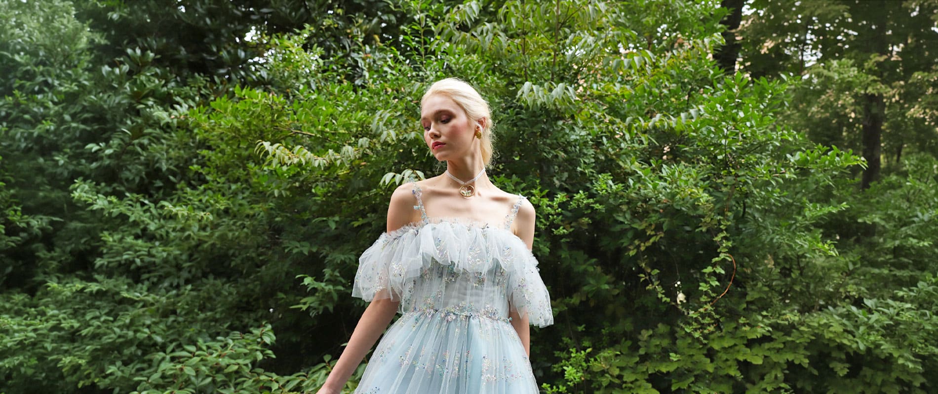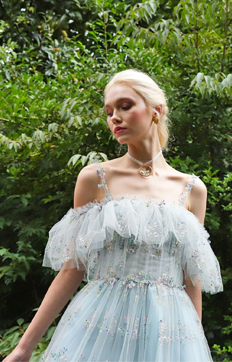 4.070,00€Delicate lace blooms across the A-line silhouette, while a flowing skirt drifts softly with every step. The embroidered capelet rests lightly on the shoulders, its intricate motifs adding a whisper of whimsy and refinement to the ensemble. Product Details • Dry Clean Only • Made in Italy