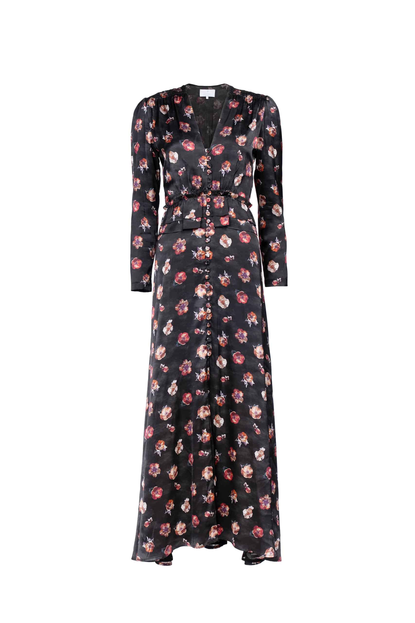 This elegant maxi dress is crafted from lightweight chiffon adorned with a pansy flower print in black. Featuring a softly structured high neckline and flowing batwing sleeves, it combines grace and modern sophistication. The fluid silhouette moves effortlessly, making it ideal for both formal occasions and stylish daytime events. Product…