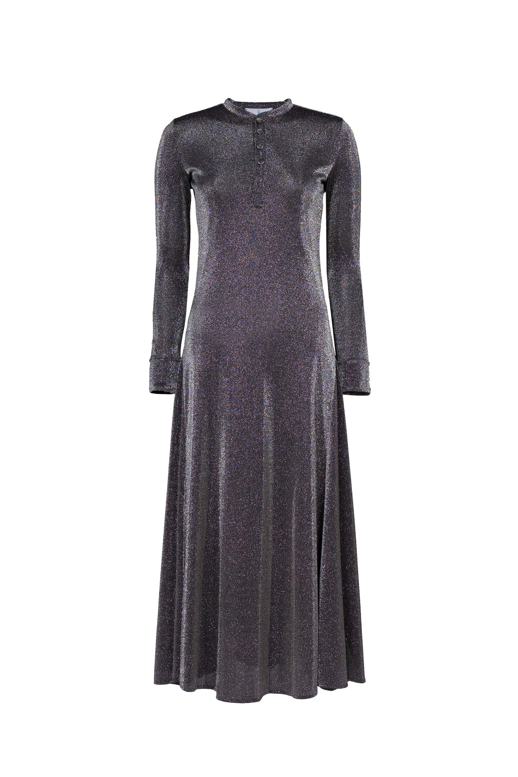 This dark purple lurex jersey dress shimmers subtly with every movement, thanks to its soft metallic finish. The flared silhouette offers fluidity and elegance, while the row of fabric-covered buttons down the front adds a refined, vintage-inspired touch. Effortlessly balancing comfort and glamour, it’s a versatile piece that transitions beautifully…