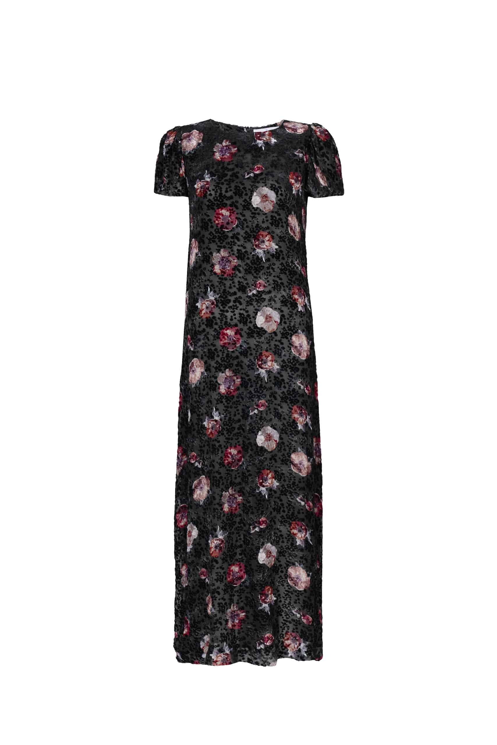This refined devoré dress features an elegant black pansy flower motif, creating a delicate interplay of texture and transparency. Designed with short sleeves, not cut on the waist it offers a romantic yet sophisticated silhouette that drapes gracefully perfect for evening occasions or elegant daytime events. Product Details • Short…