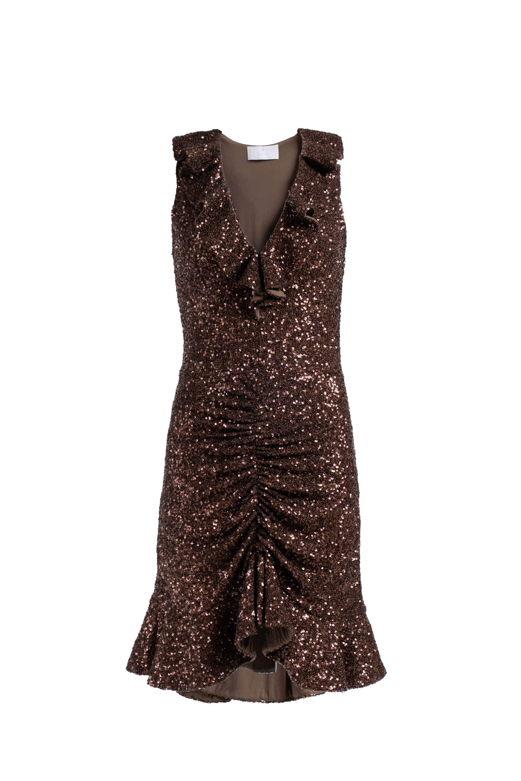 This elegant brown sequin dress features a flattering halter neckline, beautifully enhanced by a soft ruffle that frames the collar. A second ruffle along the hem adds a playful, feminine finish. Made from a stretch sequin fabric, it offers both comfort and a figure-enhancing fit perfect for evening events or…