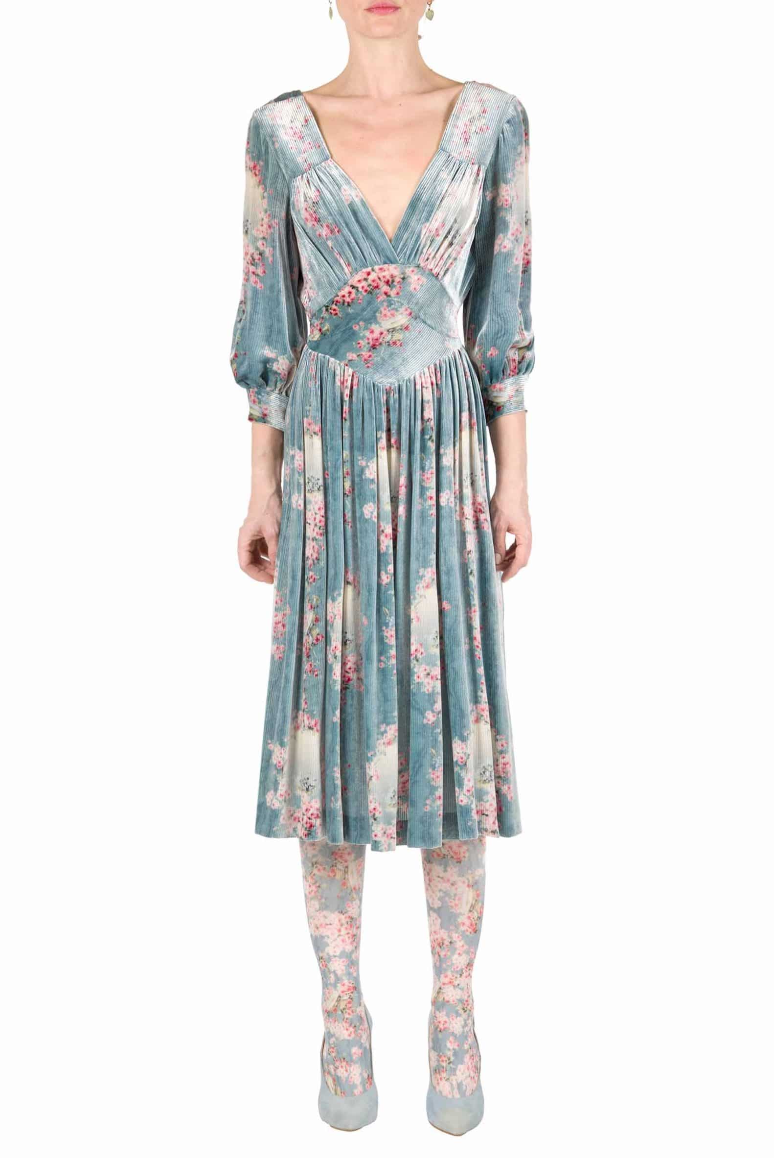 This dress is crafted with printed velvet devorè. It has a plunging V neckline, three-quarter puff sleeves and a wide waistband which define your silhouette. Product Details ● Knee Length ● V neckline ● Composition: RA 82 % SE 18 % ● Dry clean only ● Made in Italy