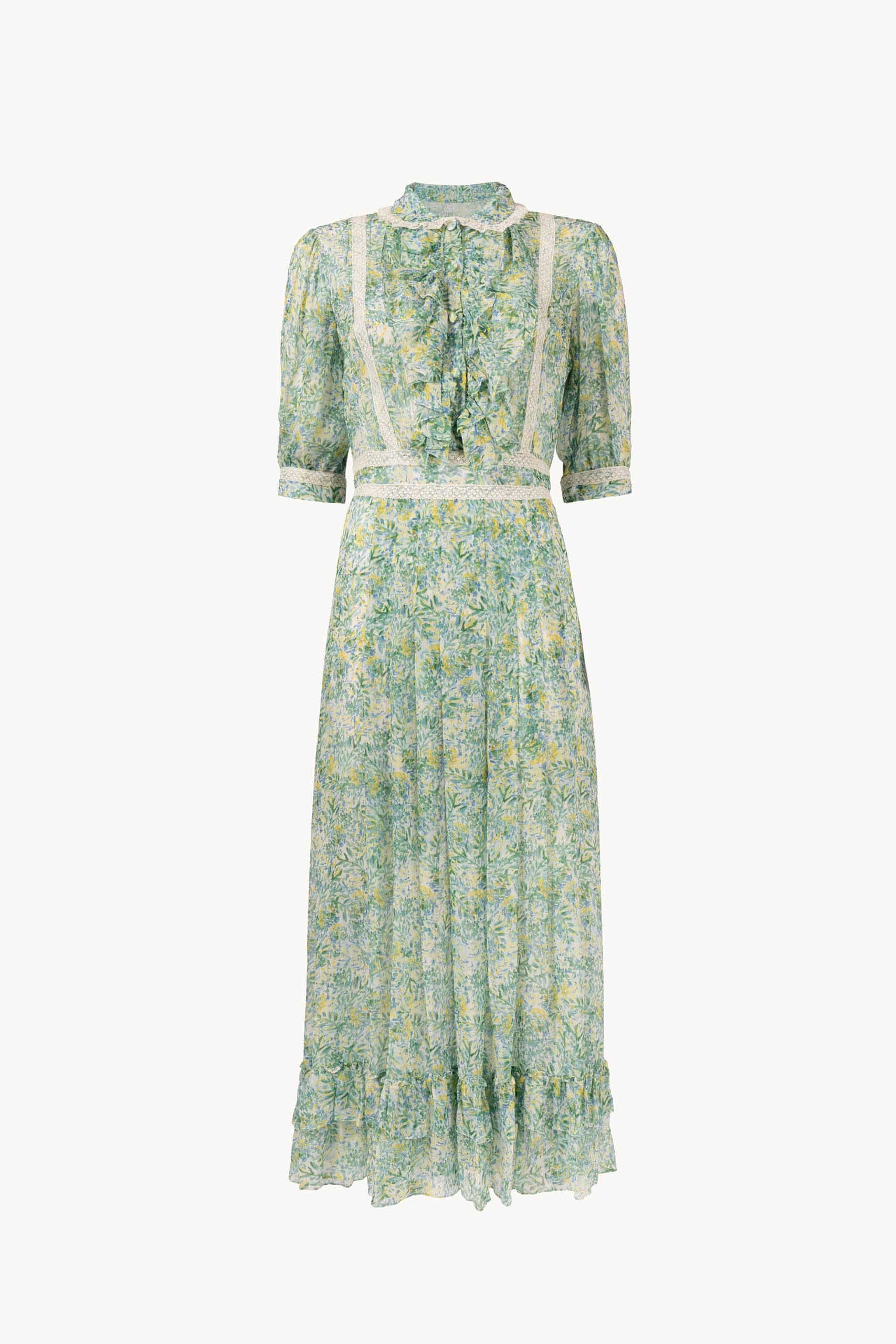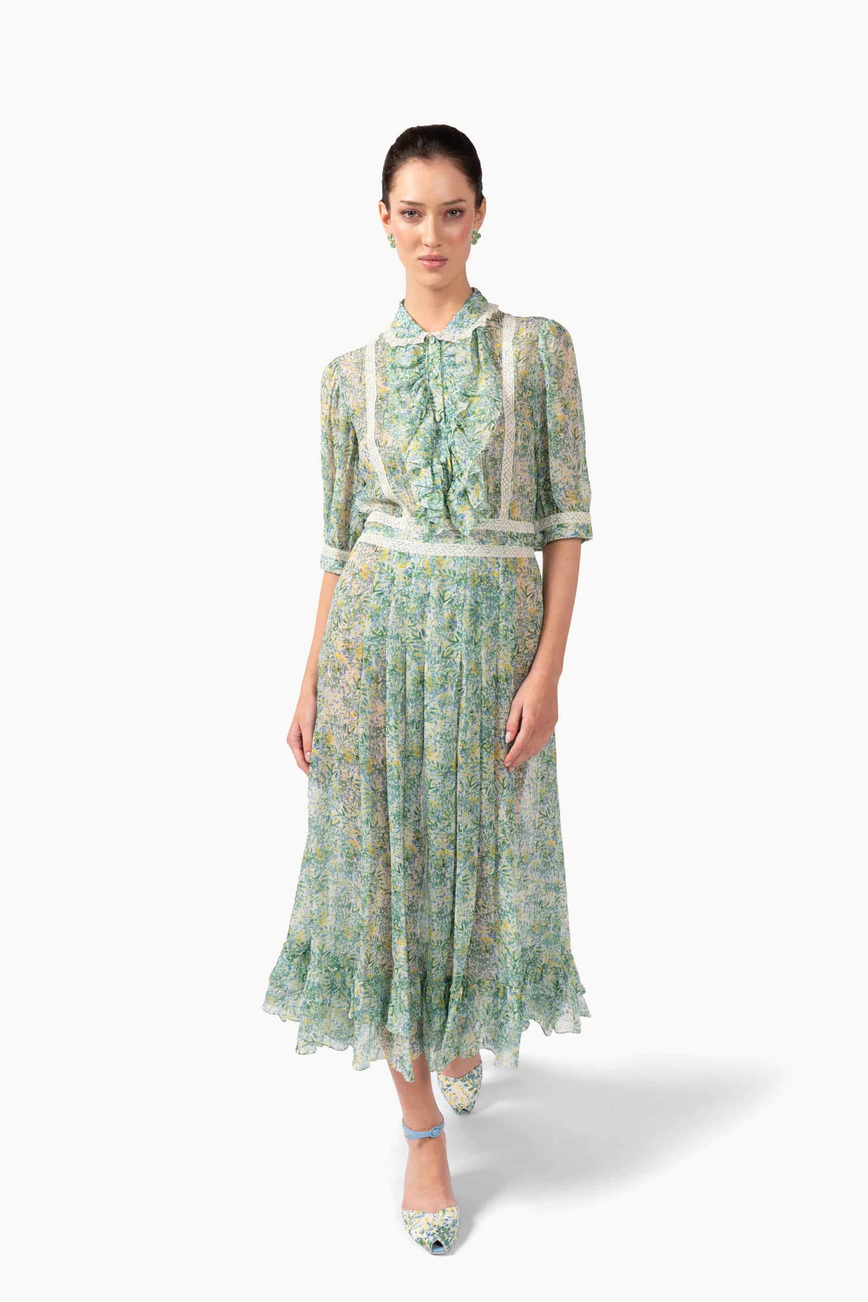 This flowing chiffon dress is adorned with a delicate printed motif and enhanced with intricate lace inserts along the bodice and hem. Airy and ethereal, it combines romantic details with effortless elegance, ideal for daytime occasions and graceful outings. Product Details • Dry Clean Only • Made in Italy