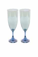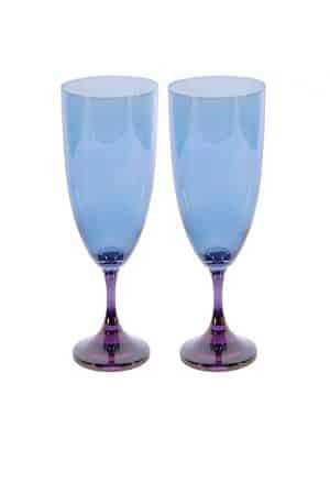 This set of two chalice flute glasses is crafted in a vibrant shade from blue to green. The glass features a smooth finish on the exterior.