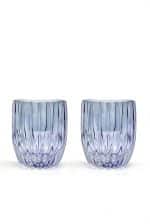This set of two small tumbler glasses is crafted in a vibrant shade of blue. This glass is vertically grooved with a finish of iridescent.