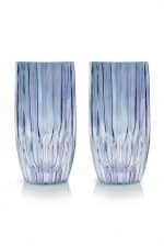 This set of two tumbler water glasses is crafted in a vibrant shade of blue. This glass is vertically grooved with a finish of iridescent.