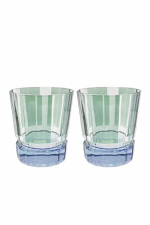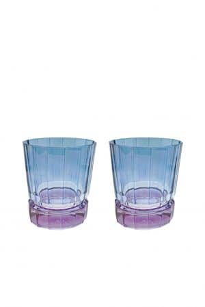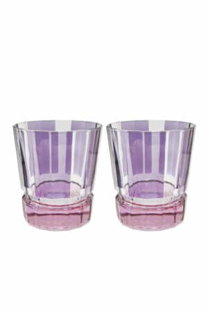 These faceted glass tumblers are crafted with vibrant stripes in blue and transparent, complemented by a purple base.