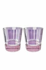 These faceted glass tumblers are crafted with vibrant stripes in purple and transparent, complemented by a pink base.