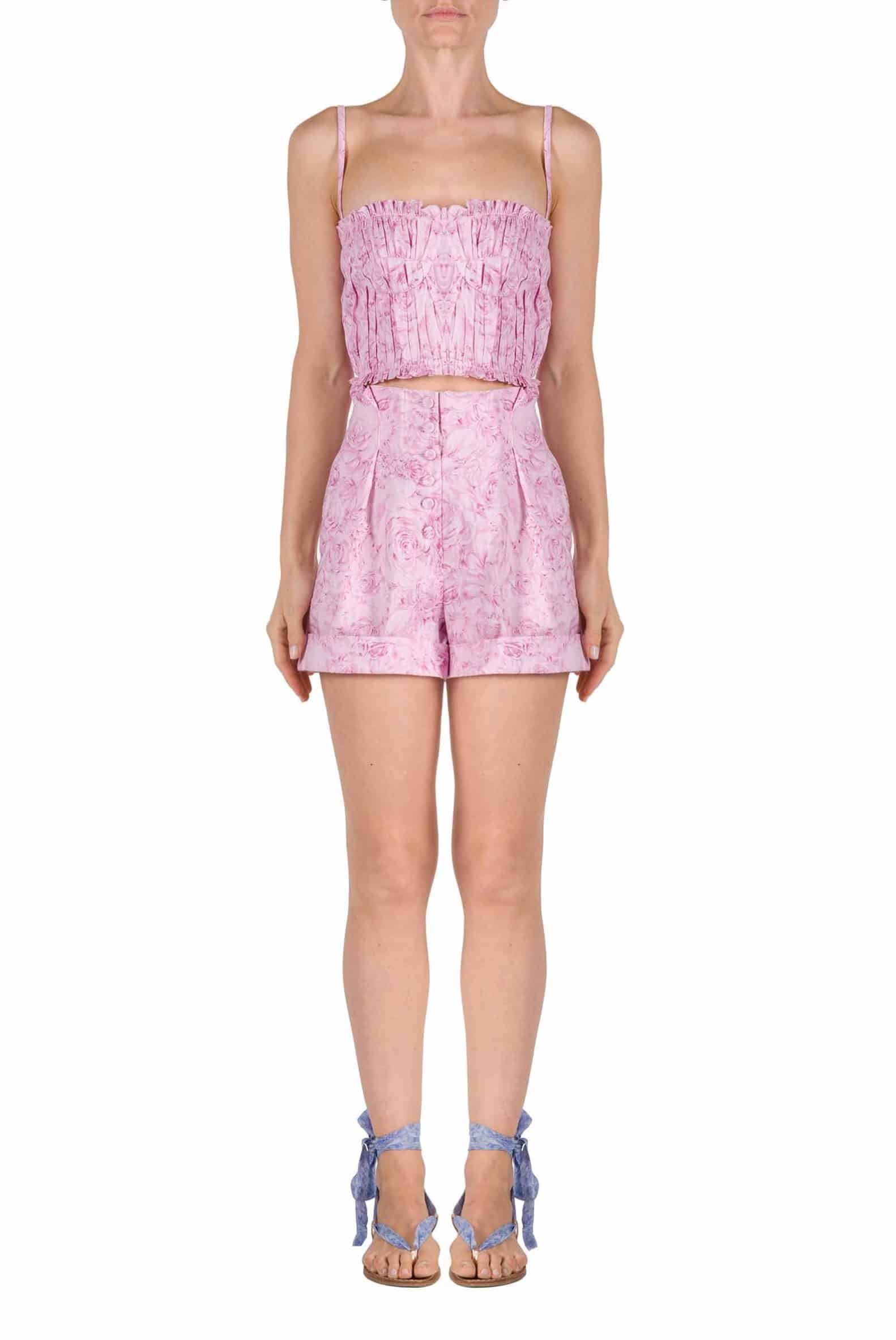 These high-waisted bermuda shorts are designed in roses printed stretch linen; they have pleads and folded hem detail. Product Details • Front covered buttons • Composition: 72% LI, 2% EA, 26% RY • Dry Clean Only • Made in Italy