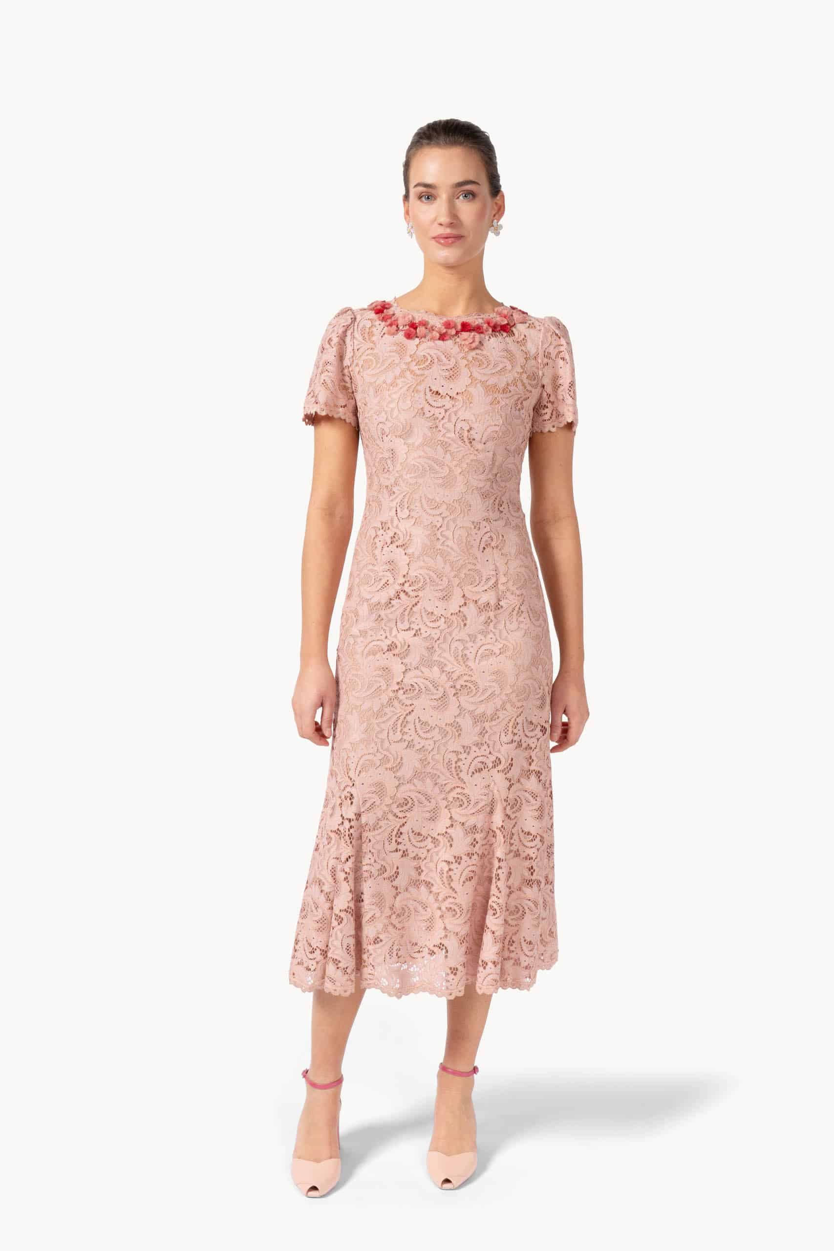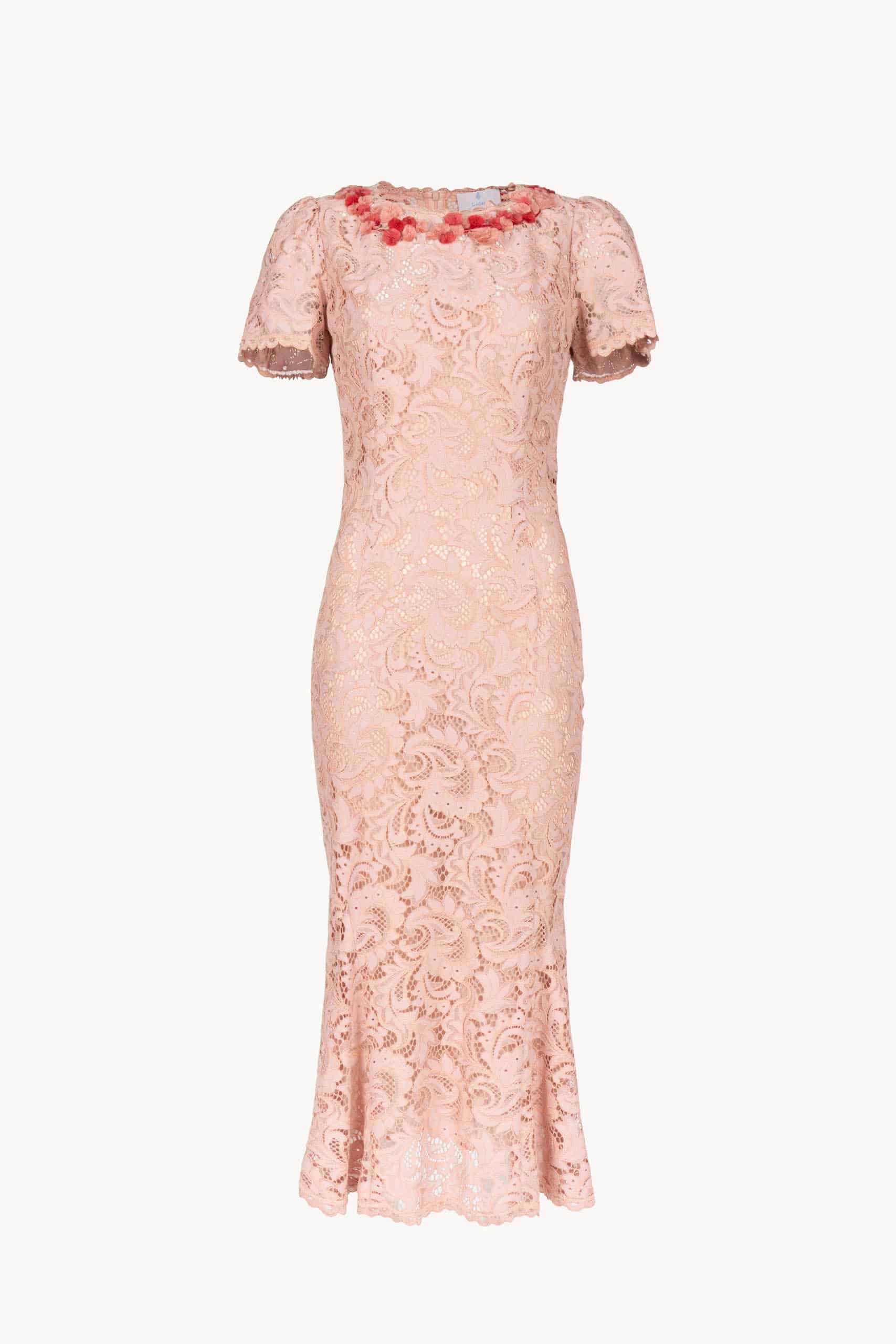 Delicate lace blooms across the A-line silhouette, while a flowing skirt drifts softly with every step. The embroidered capelet rests lightly on the shoulders, its intricate motifs adding a whisper of whimsy and refinement to the ensemble. Product Details • Dry Clean Only • Made in Italy
