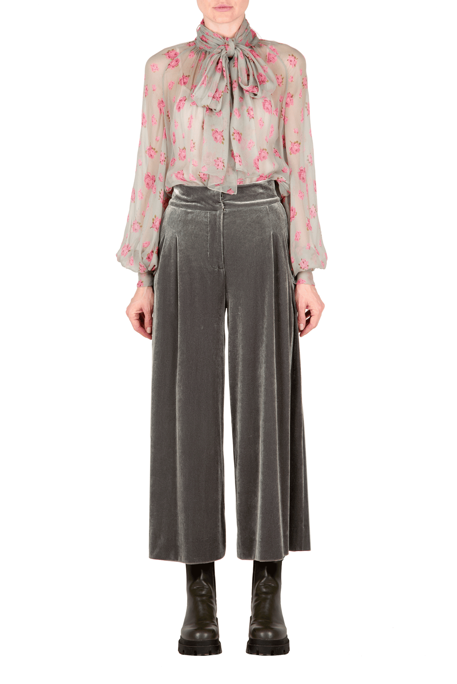 This stretch velvet wide pants are designed with a high waisline and two front pleats. Product Details • Ankle length • Unlined • Concealed zip fastening in the back • Composition: 90% PL 10% SP • Dry clean only • Made in Italy