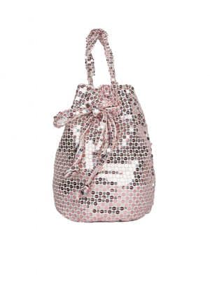This shining bucket bag is made with sequin embroidered fabric. With drawstrings of the same color, this bag creates a party mood wherever you go.