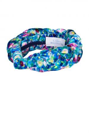 This shiny satin power hairband, it’s made with a pink color base that’s intricately braided.