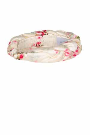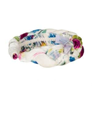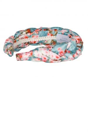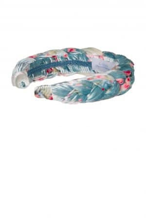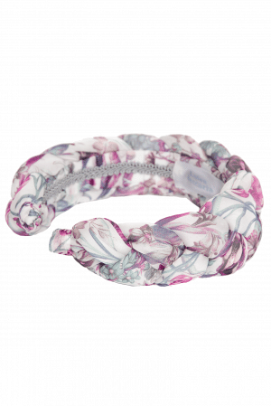 This shiny satin power hairband, it’s made with a pink color base that’s intricately braided.