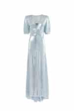 A button-front dress with balloon sleeves, embellished with water-effect sequins that shimmer with every movement. The playful yet elegant design creates a flattering silhouette, while the sequins add a touch of sparkle and sophistication. Perfect for evening events or special occasions, this dress combines charm with a modern, glamorous edge.