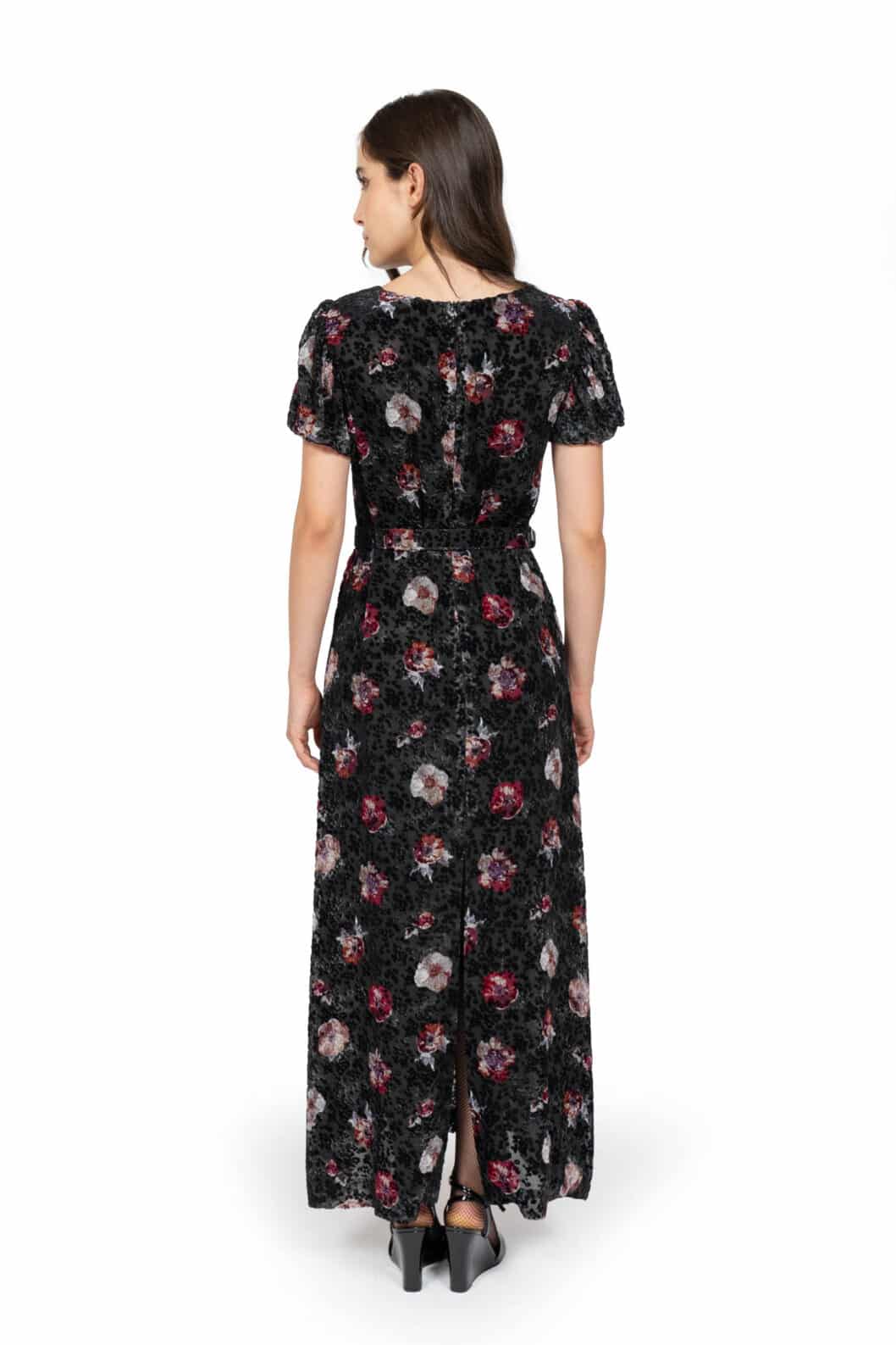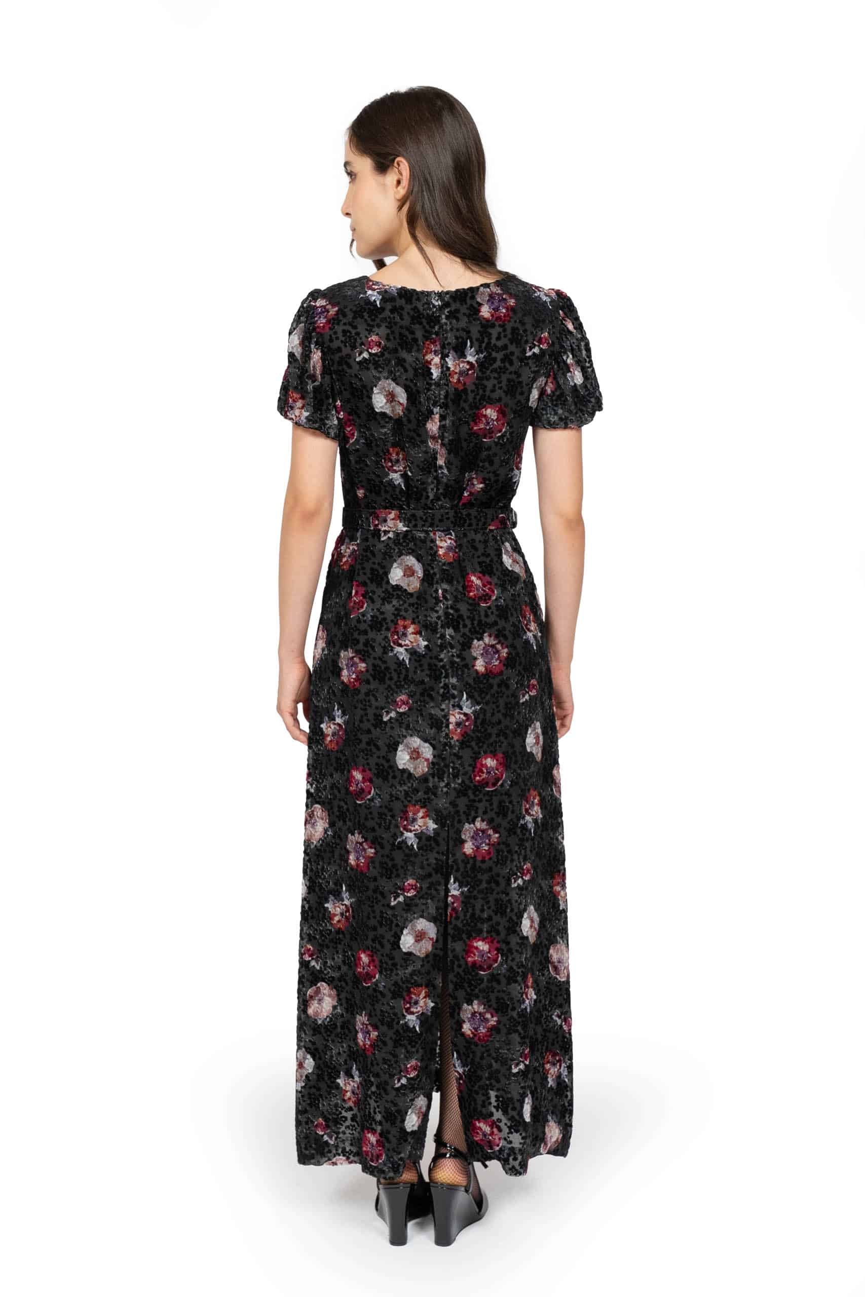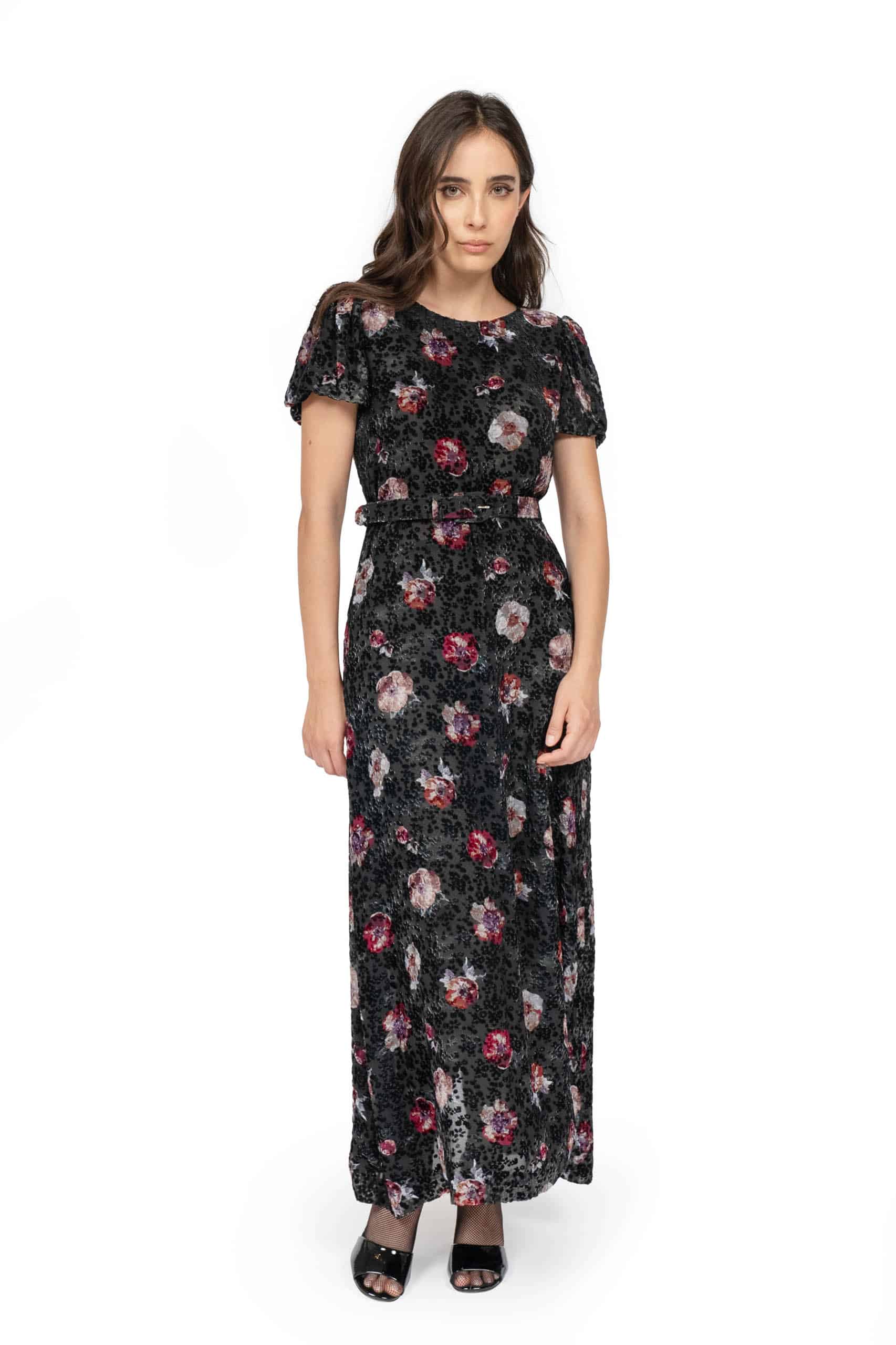 This refined devoré dress features an elegant black pansy flower motif, creating a delicate interplay of texture and transparency. Designed with short sleeves, not cut on the waist it offers a romantic yet sophisticated silhouette that drapes gracefully perfect for evening occasions or elegant daytime events.