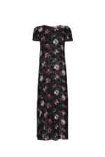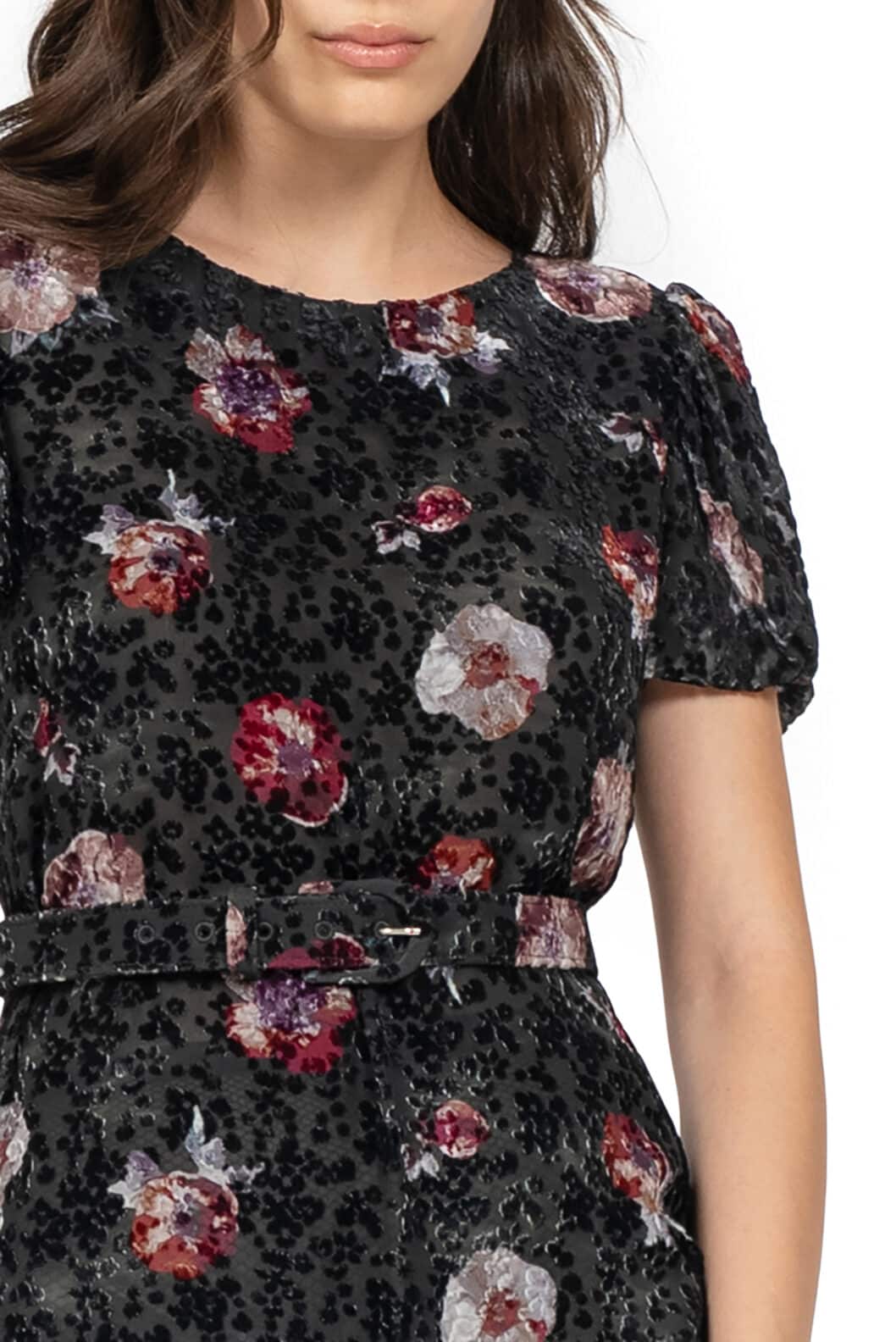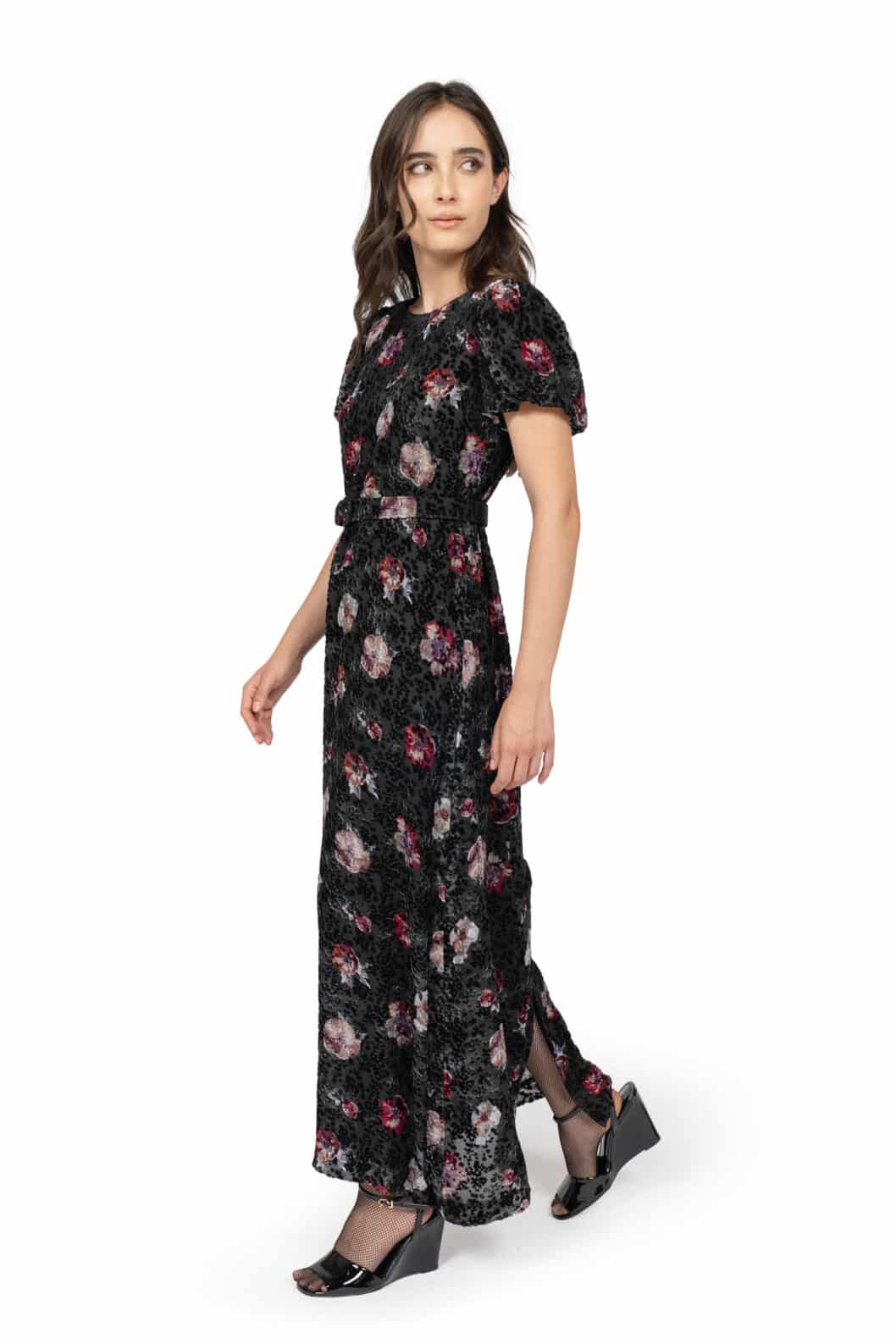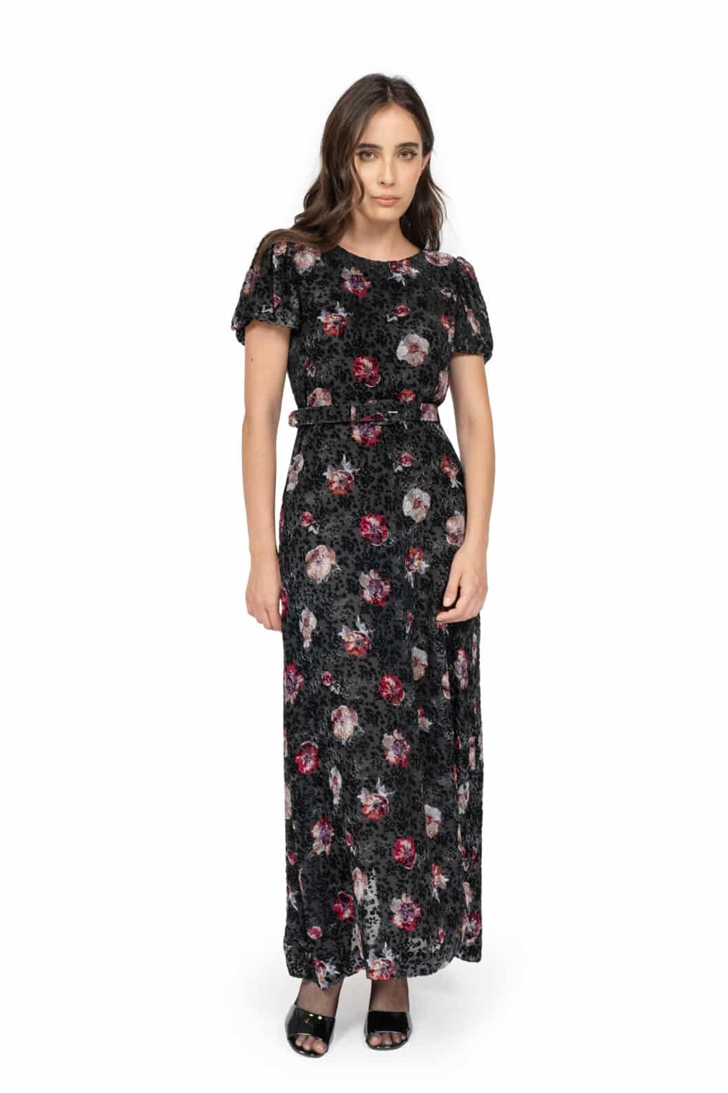 This refined devoré dress features an elegant black pansy flower motif, creating a delicate interplay of texture and transparency. Designed with short sleeves, not cut on the waist it offers a romantic yet sophisticated silhouette that drapes gracefully perfect for evening occasions or elegant daytime events.