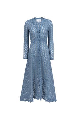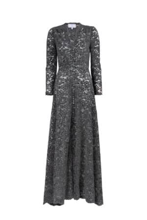 This bottoncino dress is realised with printed satin. It has little buttons on the front with a plunging V neck and long sleeves. The cinched empire waist define your frame and the asymmetrical length make this dress perfect for your special occasion.