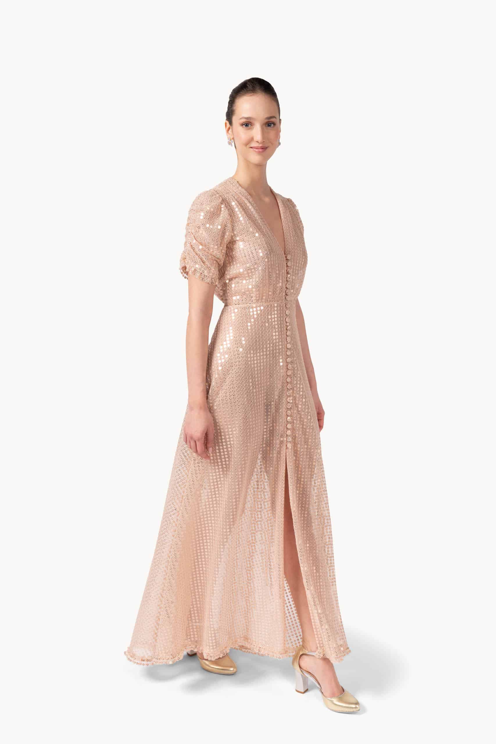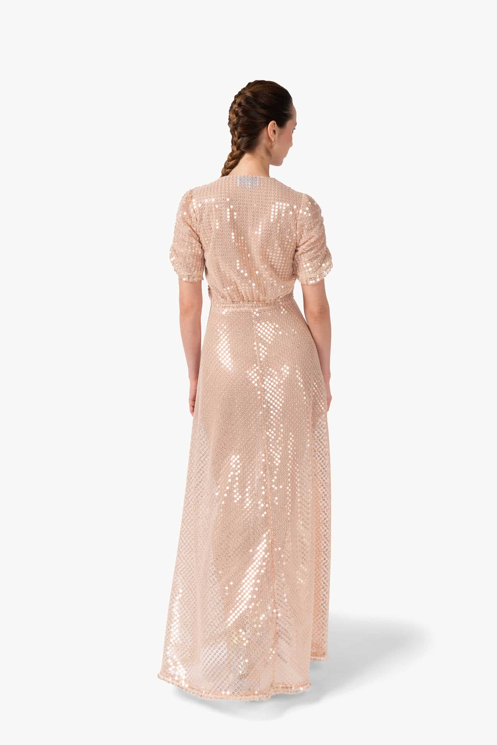 Shimmering maxi dress fully adorned with sequins for a glamorous, head-turning effect. The fitted bodice flows into a floor-length skirt, creating an elegant silhouette that moves gracefully with every step.