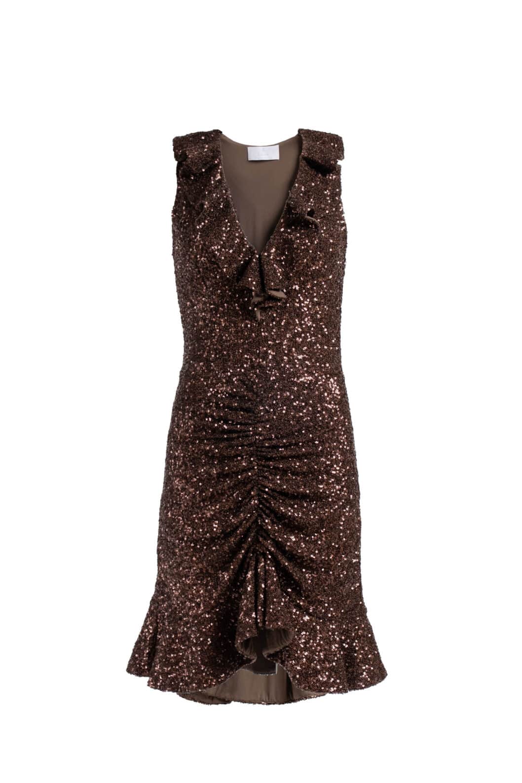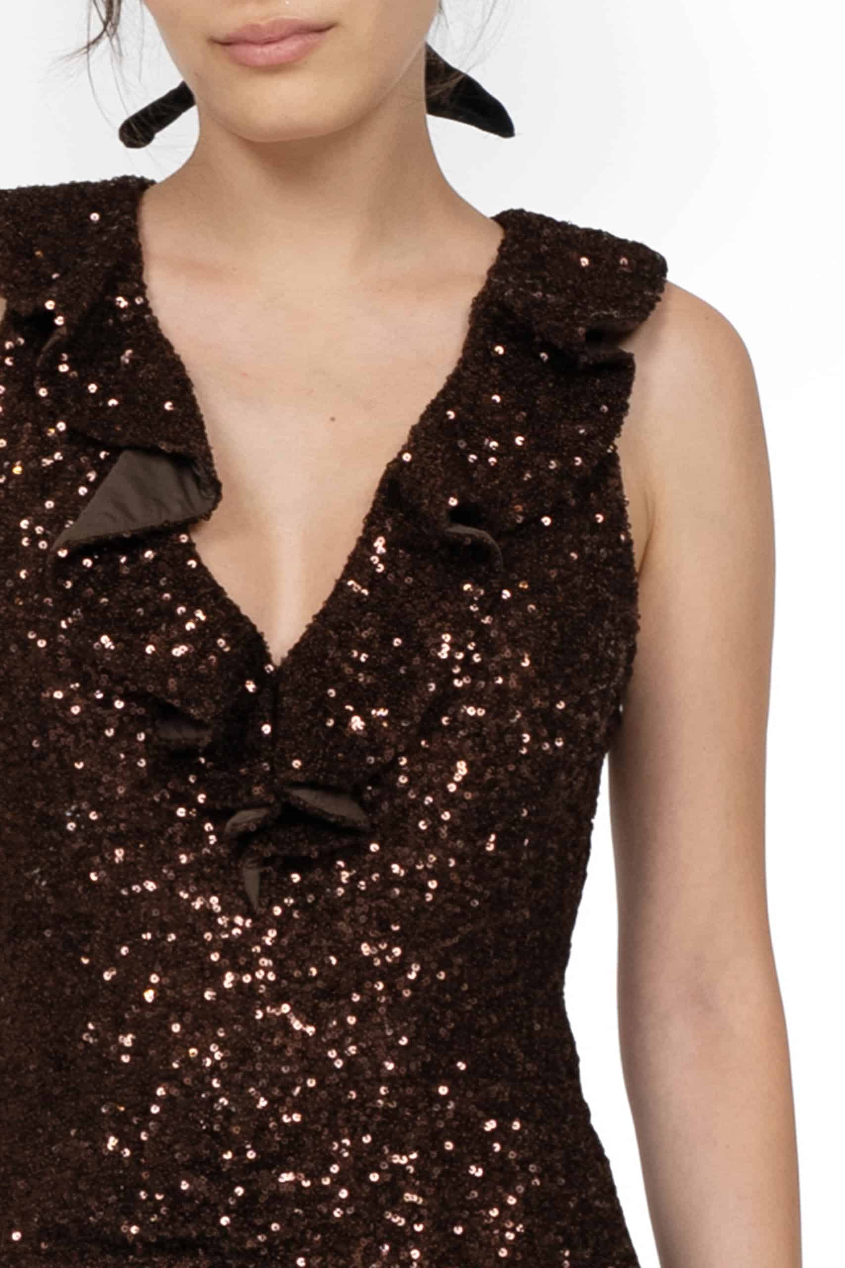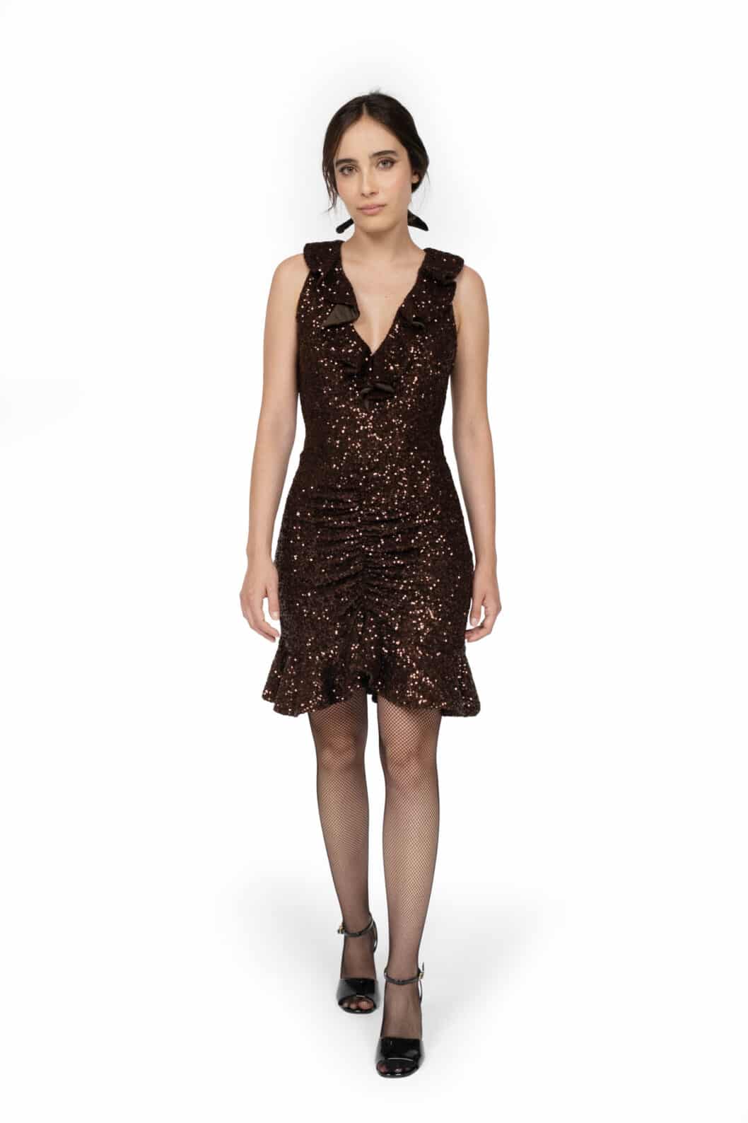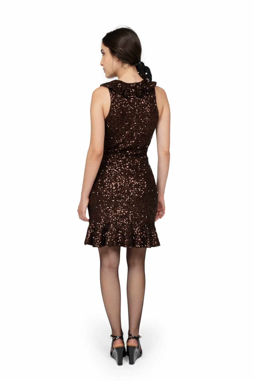 This elegant brown sequin dress features a flattering halter neckline, beautifully enhanced by a soft ruffle that frames the collar. A second ruffle along the hem adds a playful, feminine finish. Made from a stretch sequin fabric, it offers both comfort and a figure-enhancing fit perfect for evening events or festive occasions.