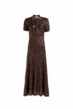 This stunning brown sequin dress combines glamour and comfort with its stretch fabric that hugs the silhouette gracefully. Featuring a stylish polo-inspired collar, it adds a sporty-chic twist to the sparkling design. Perfect for evening events where you want to shine with ease and sophistication.