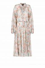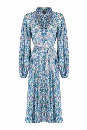 This “Carlamaria” dress is made from floral printed georgette; it is designed for a relaxed fit and cut for full skirt silhouette marked by a self-tie belt. It comes with a slit in solid