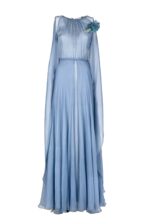 This romantic gown is perfect for a black-tie event. Made from blue chiffon crepon, it is characterised by a translucent cape on the shoulders that creates movement and makes your entrance unforgettable.