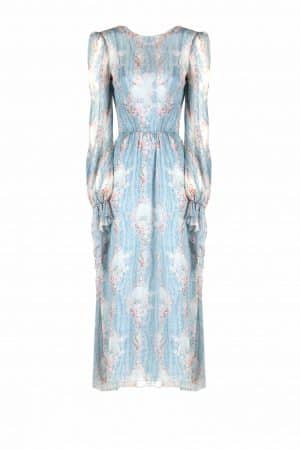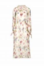 This midi dress is made with a floral printed chiffon. It has ballon long sleeves, an attached scarf on the neck and a belt around the hips. It has a fluid A line silhouette and is cut to fall below the knee.