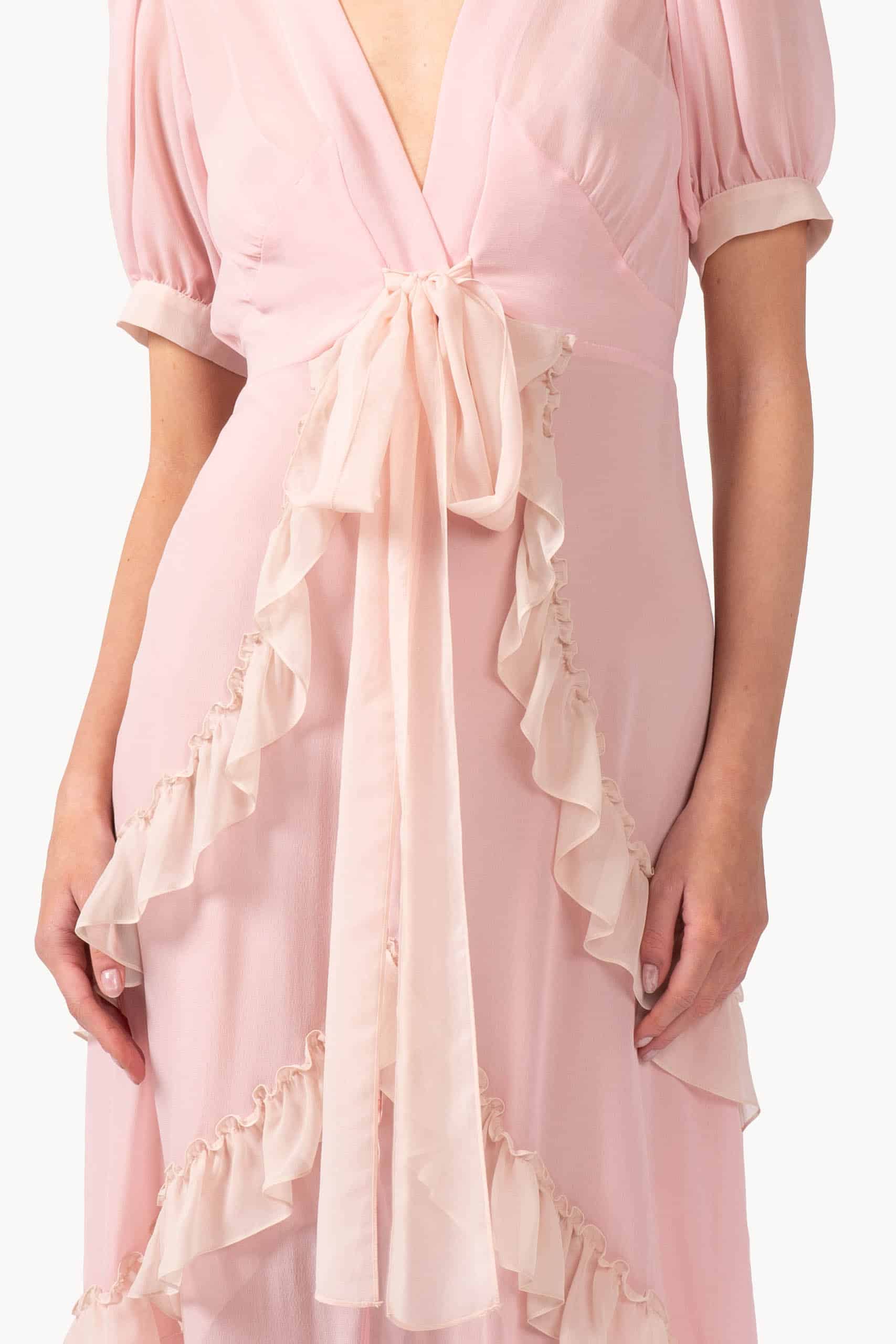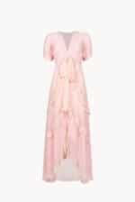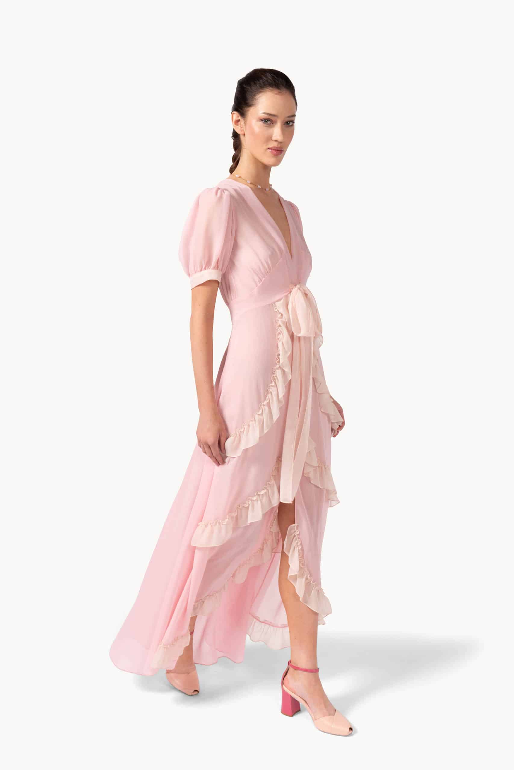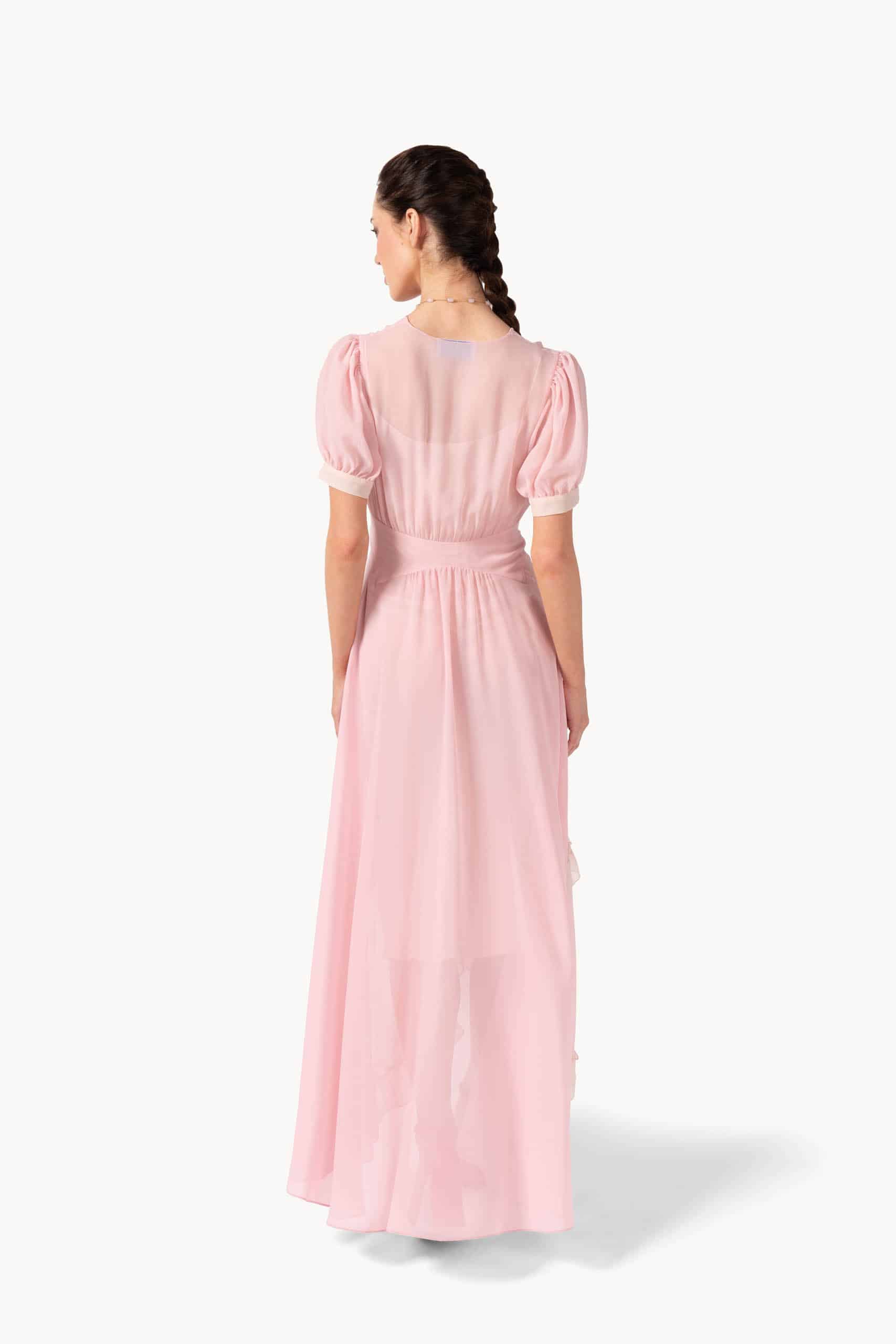 Layers of cascading ruffles create a romantic, flowing silhouette in this pink gown. The soft drape and floor-length design move gracefully with every step, while delicate detailing along the neckline and shoulders adds a feminine, whimsical touch.