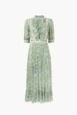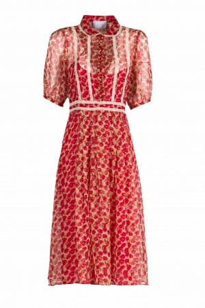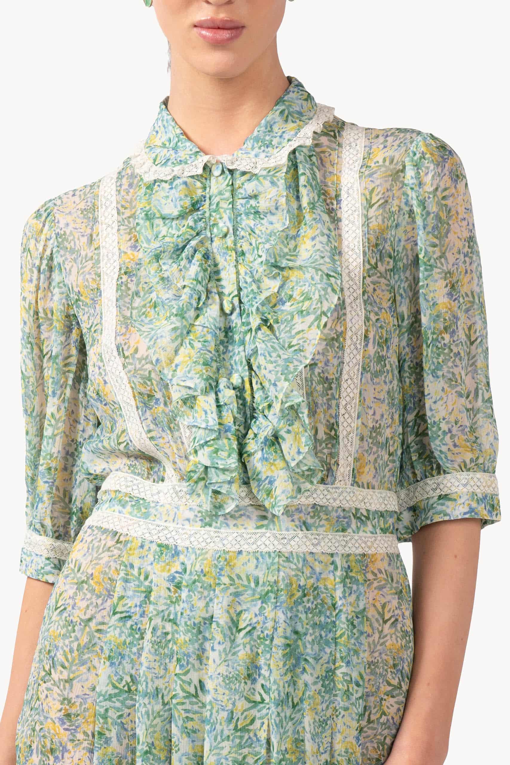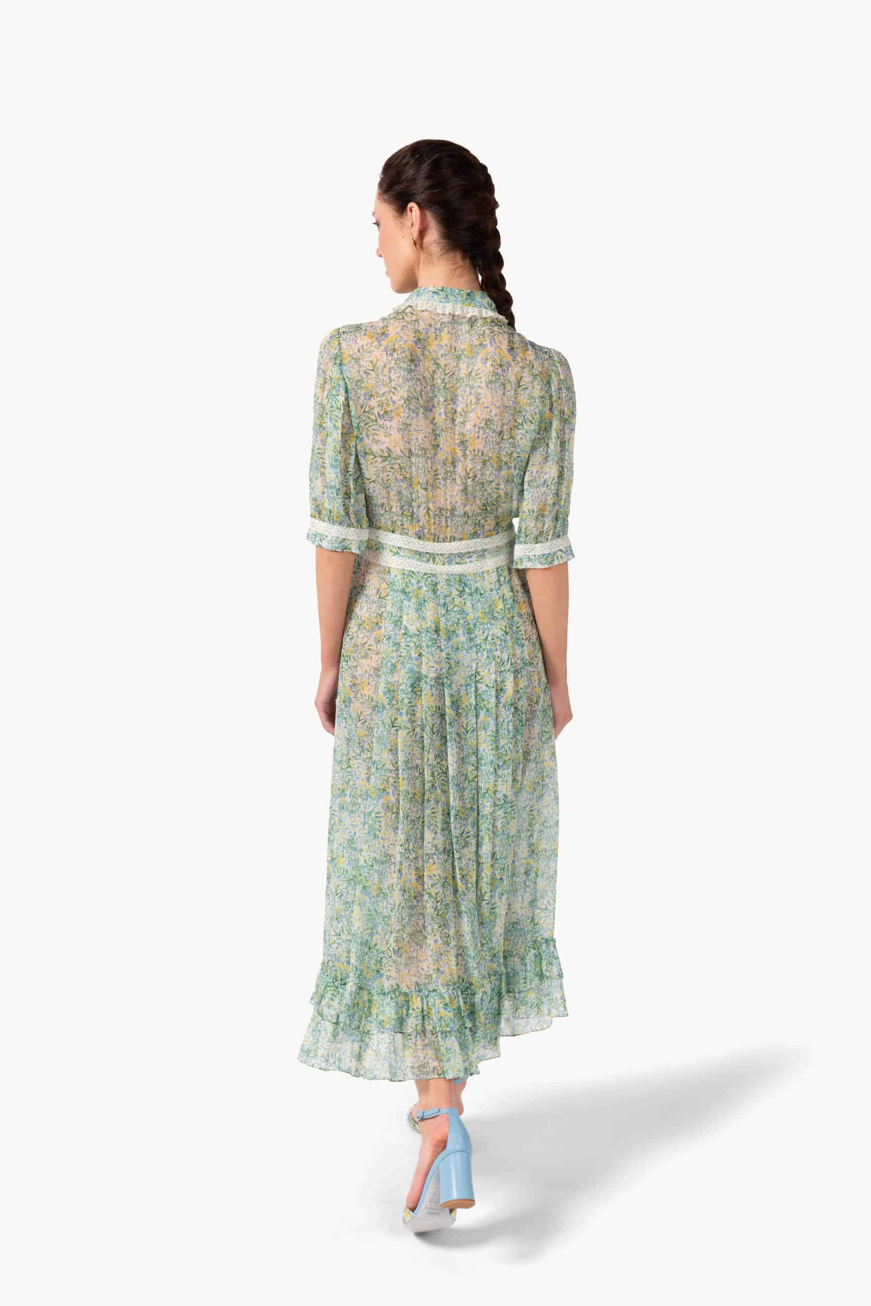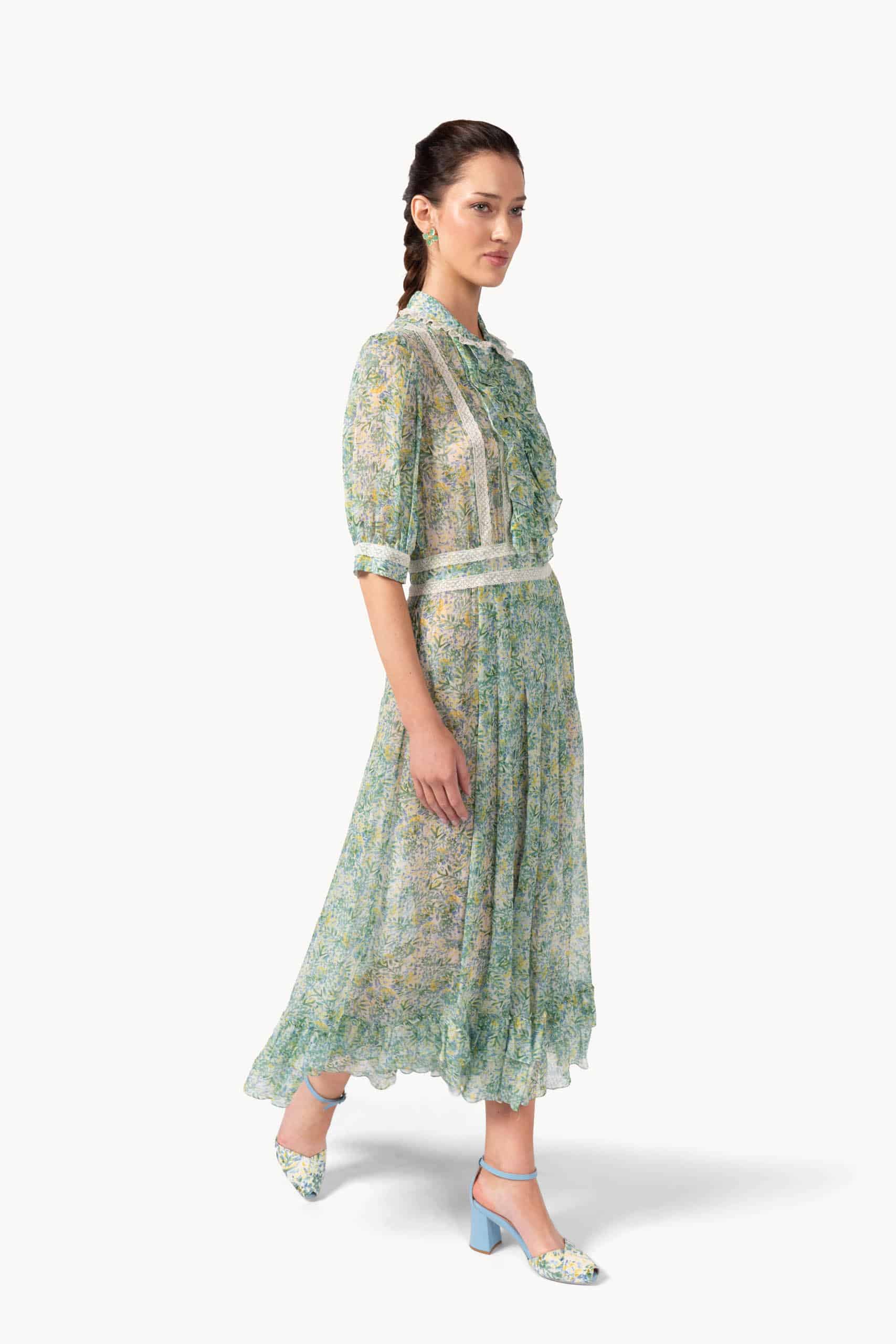 Coral Green Printed Chiffon Chemisier Dress With Lace Inserts