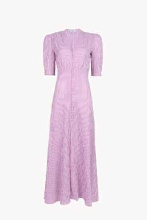 This lace bottoncino dress has a scalloped V-neckline with an A-line silhouette and short sleeves. The dress is fully lined with georgette.