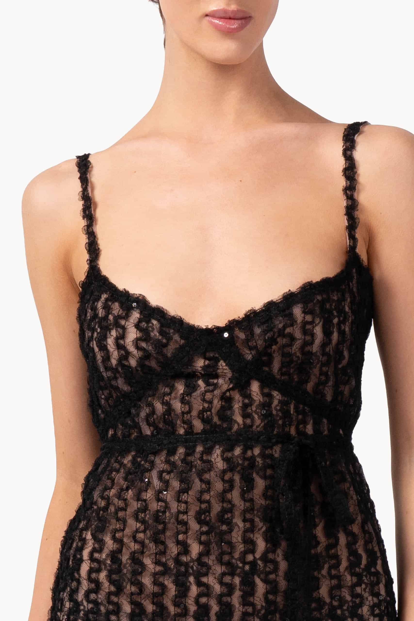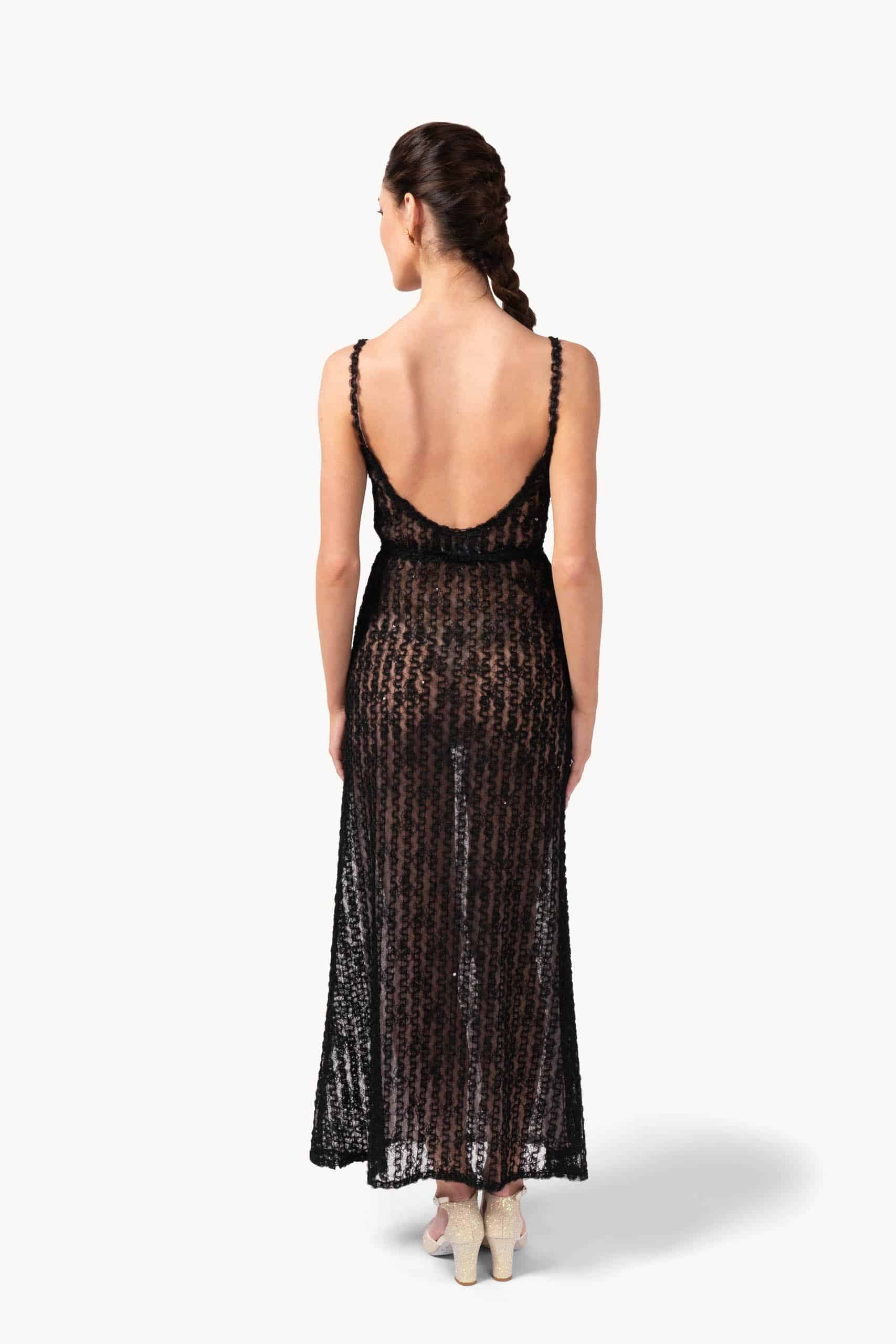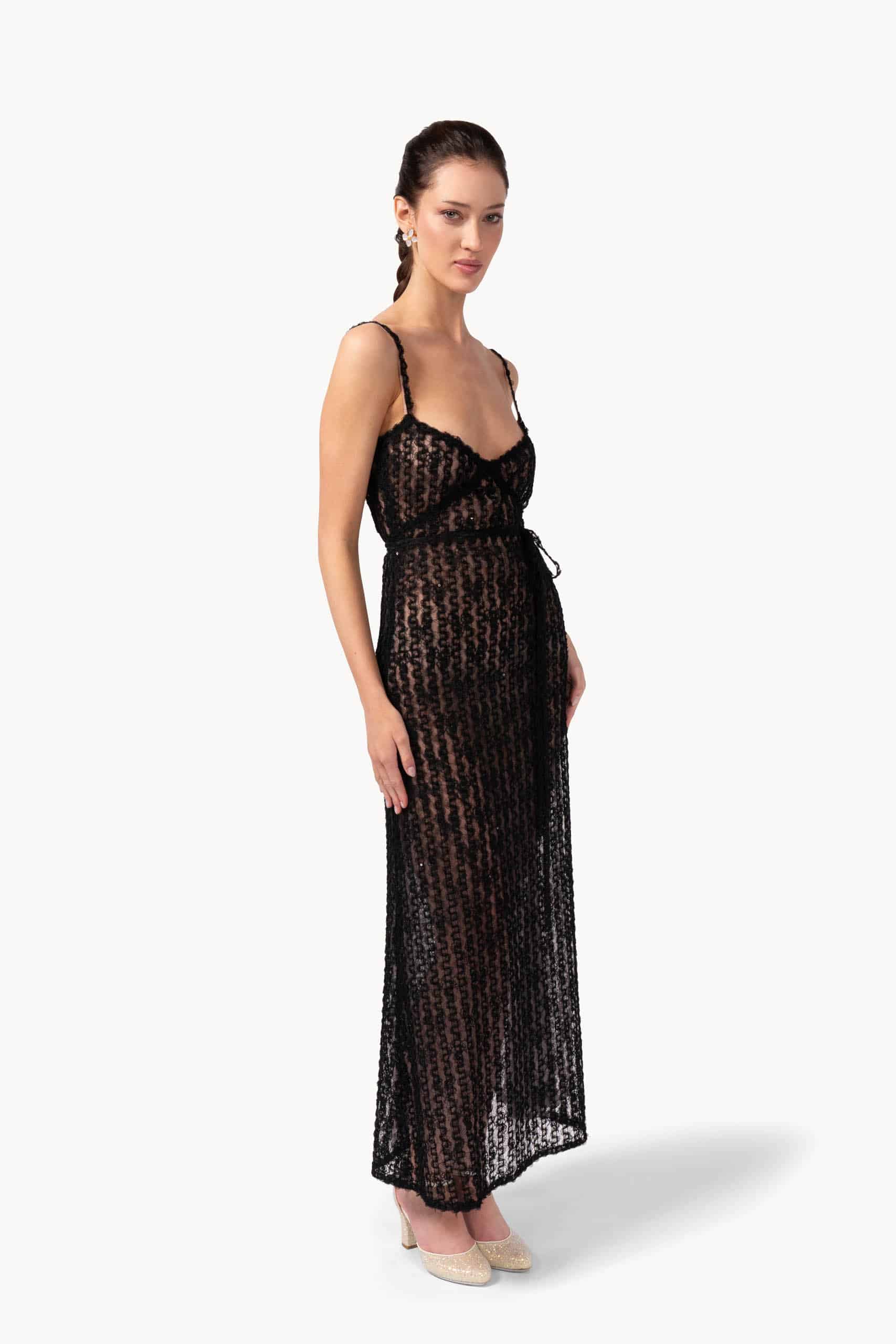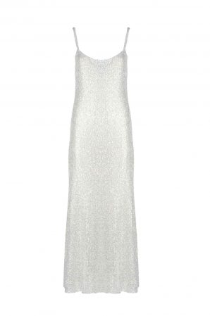 This slip dress combines soft tulle and organza with sparkling sequin embroidery for a striking, elegant look. The straight, relaxed fit skims the body, while the floor-length hem ensures graceful movement, making it ideal for evening celebrations or formal gatherings.