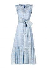 This sleeveless midi dress is designed with slim fit and ruffles around the neckline and shoulders.