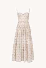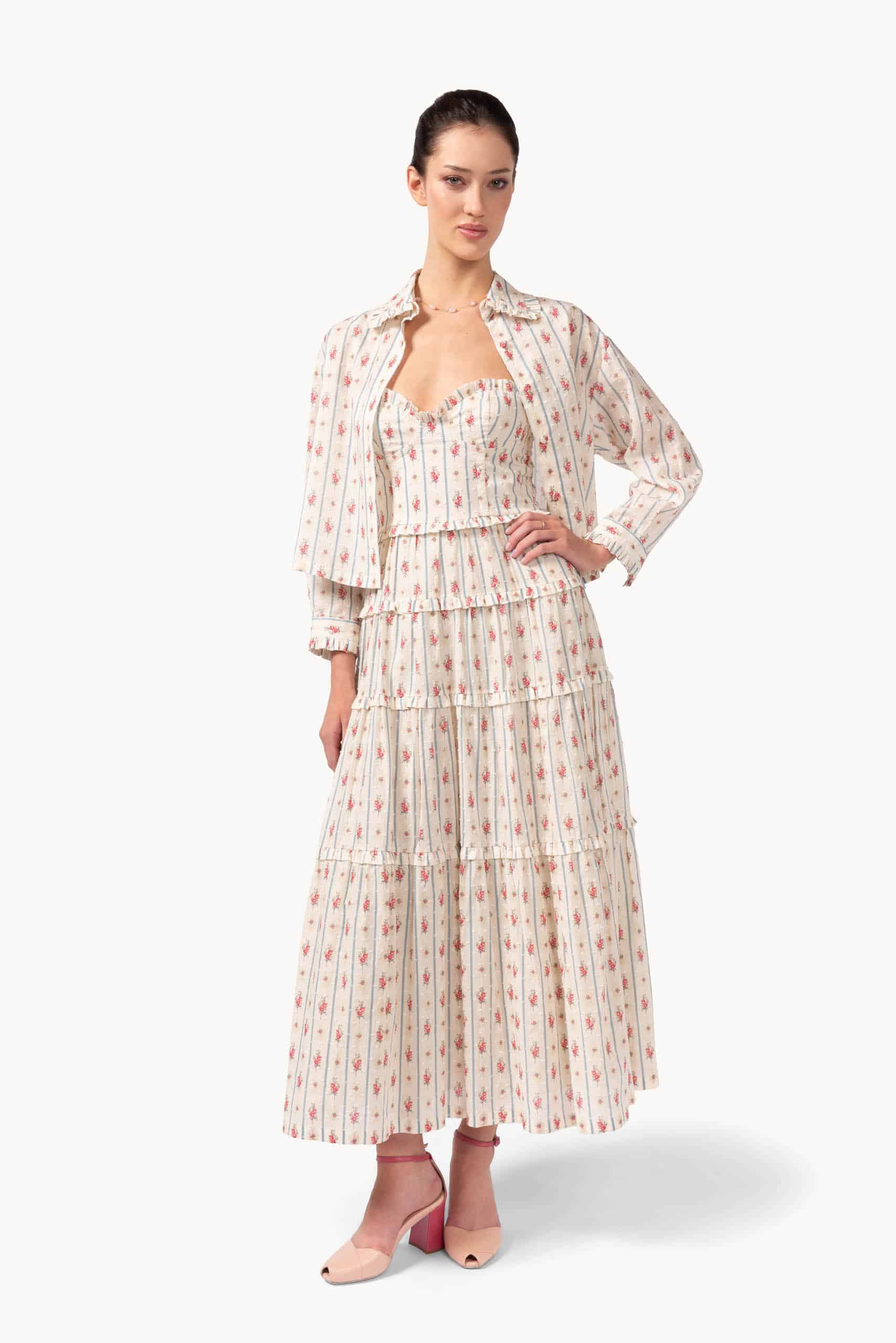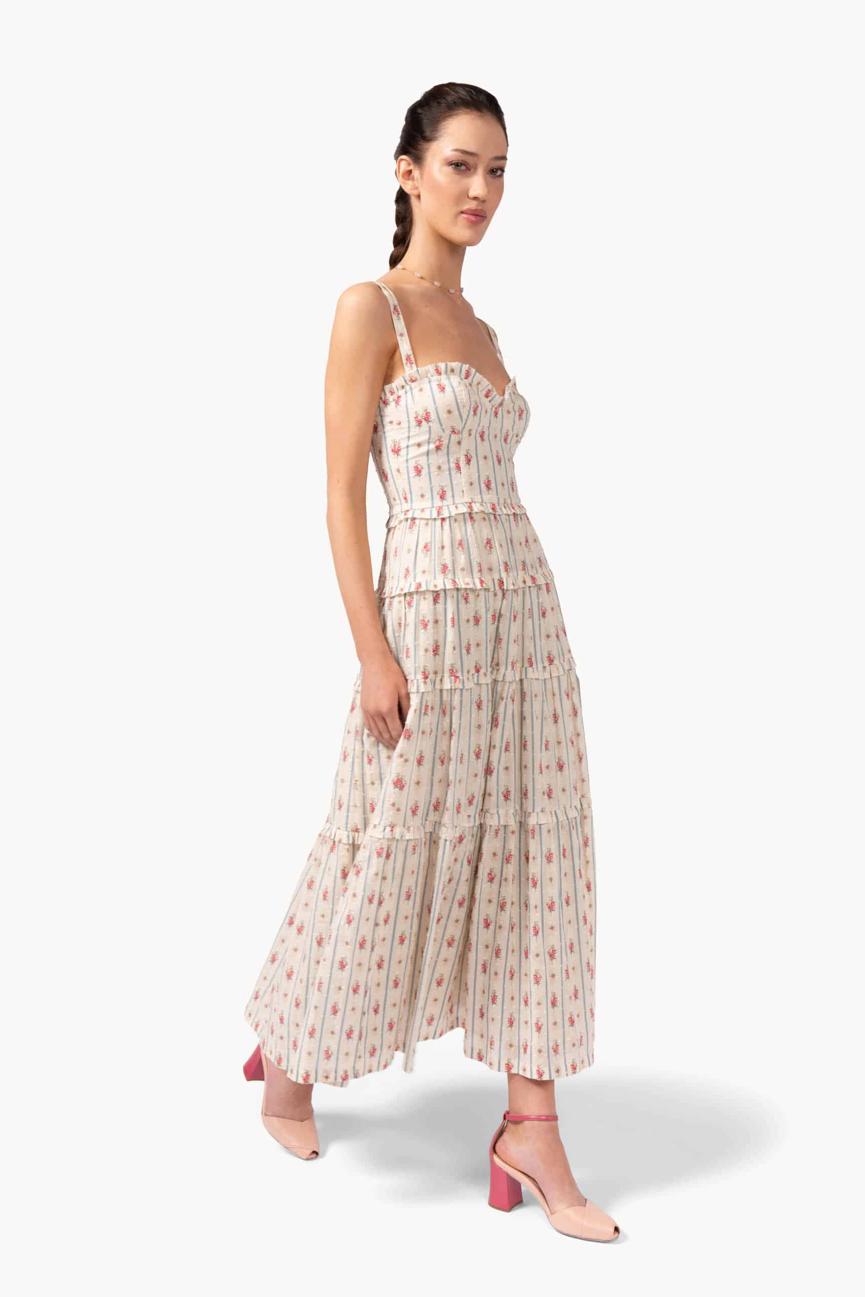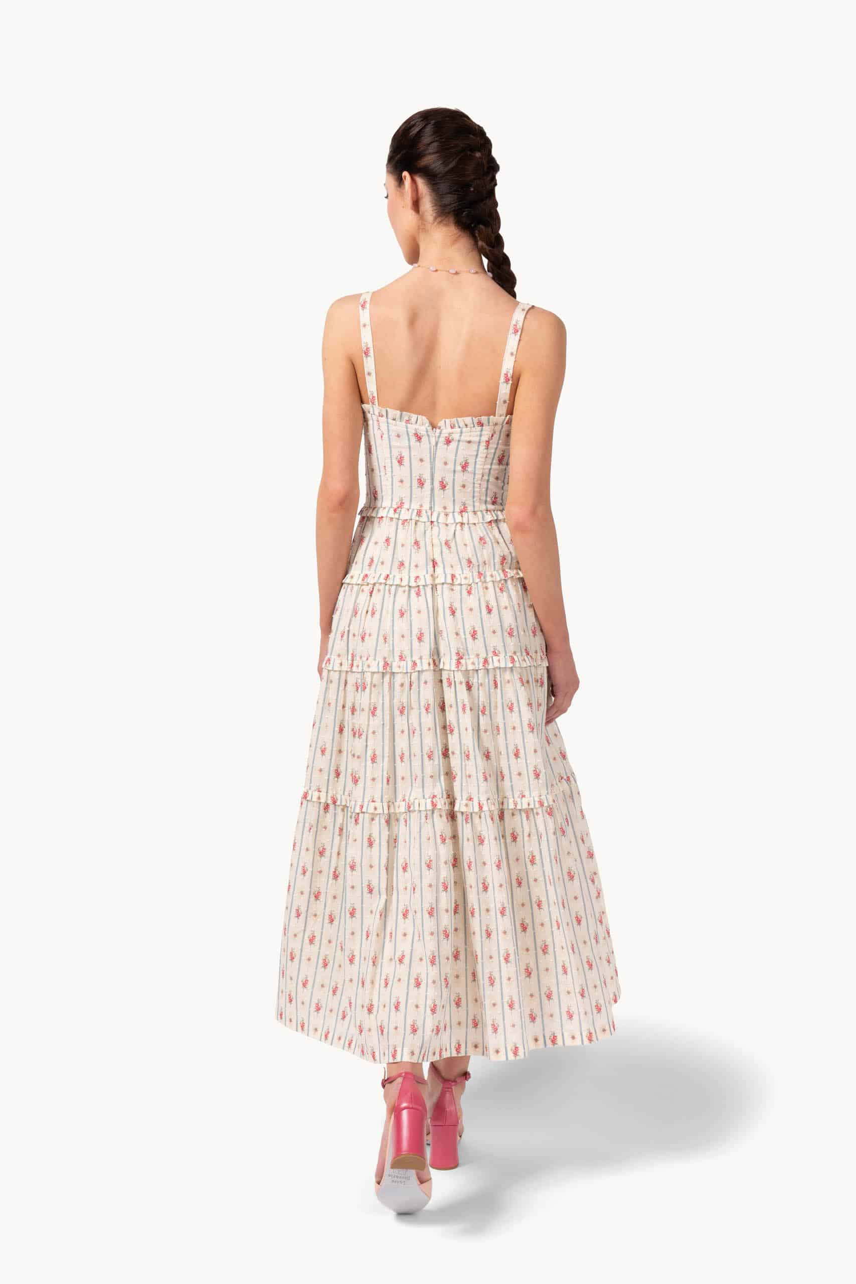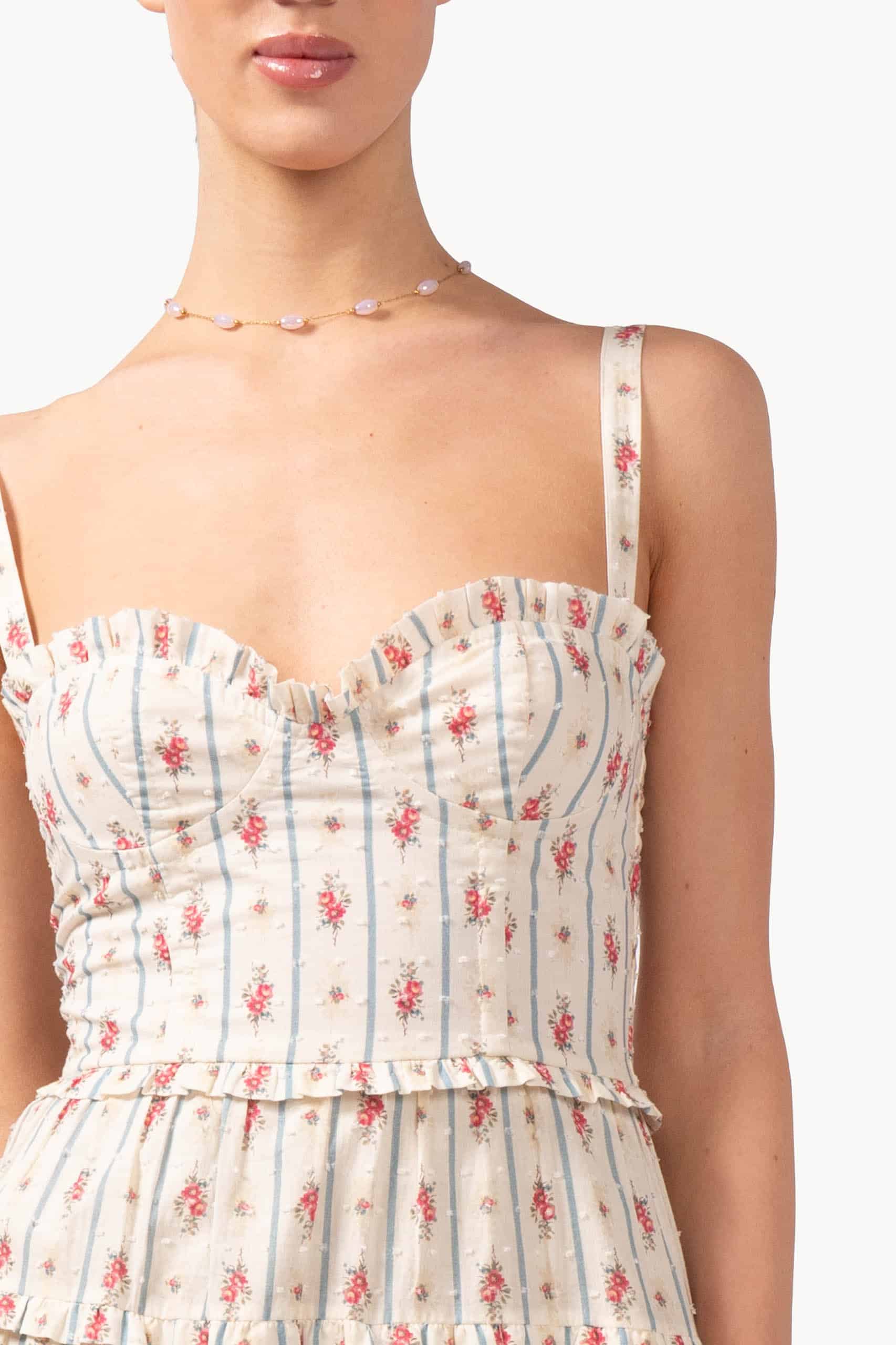 This charming midi dress combines delicate femininity with modern style. The fitted elastic bustier top gently sculpts the silhouette, providing comfort and support without sacrificing elegance.