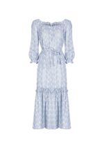 This midi shirt dress is crafted from embroidered cotton with a small floral pattern. It features a wide flounce at knee level. The elbow-length sleeve is finished with elasticized ruching. There is a keyhole opening at the center back along the neckline, closed with a metal hook. The dress can be worn with shoulder up or left down thanks to the elasticized and roughed neckline. It is sold with its removable sash belt, made of the same fabric, to accentuate the waistline.