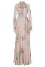 Draped in silk charmeuse, this gown is printed with a bouquet of florals. Designed with a mock neck and peasant sleeves, it has a fitted waistline that fluidly flows into a floor-grazing hem.