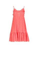 This wide mini dress is crafted from San Gallo floral lace. It features a large ruffled flounce over the knee. The top edge and along the flounce is enriched by a 3D floral lace embellishment. On the back, it features a criss-cross straps. Wear it for a day at the seaside for a vibrant summer look.
