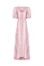Bottoncino dress is one of our iconic styles and is cut from Flowery striped silk. With a V-neckline and puffed short sleeves, this dress is perfect for a cocktail. Wear it with strappy heels and a small clutch.
