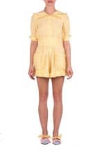 Gingham cotton blend jumpsuit is designed with ruffled patch pockets along the front, belted waist that ties in back, and a puritan collar with square detail in the back.