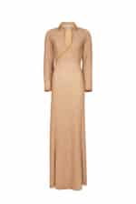 This radiant gold lurex dress is crafted from a stretch fabric that gently follows the body, offering both comfort and shimmer. It features a refined keyhole neckline and a collar embellished with dark gold trim, adding a rich, textural accent to the luminous fabric. A perfect piece for elegant evenings or festive celebrations.