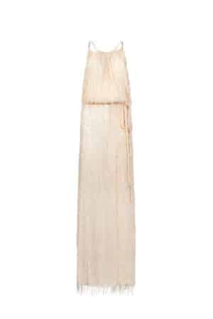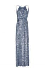This long blue dress features a high leg slit and American neckline. Open on the back and covered with sequins all over, it gives comfort for the movement and it’s perfect to make you shine at any party.