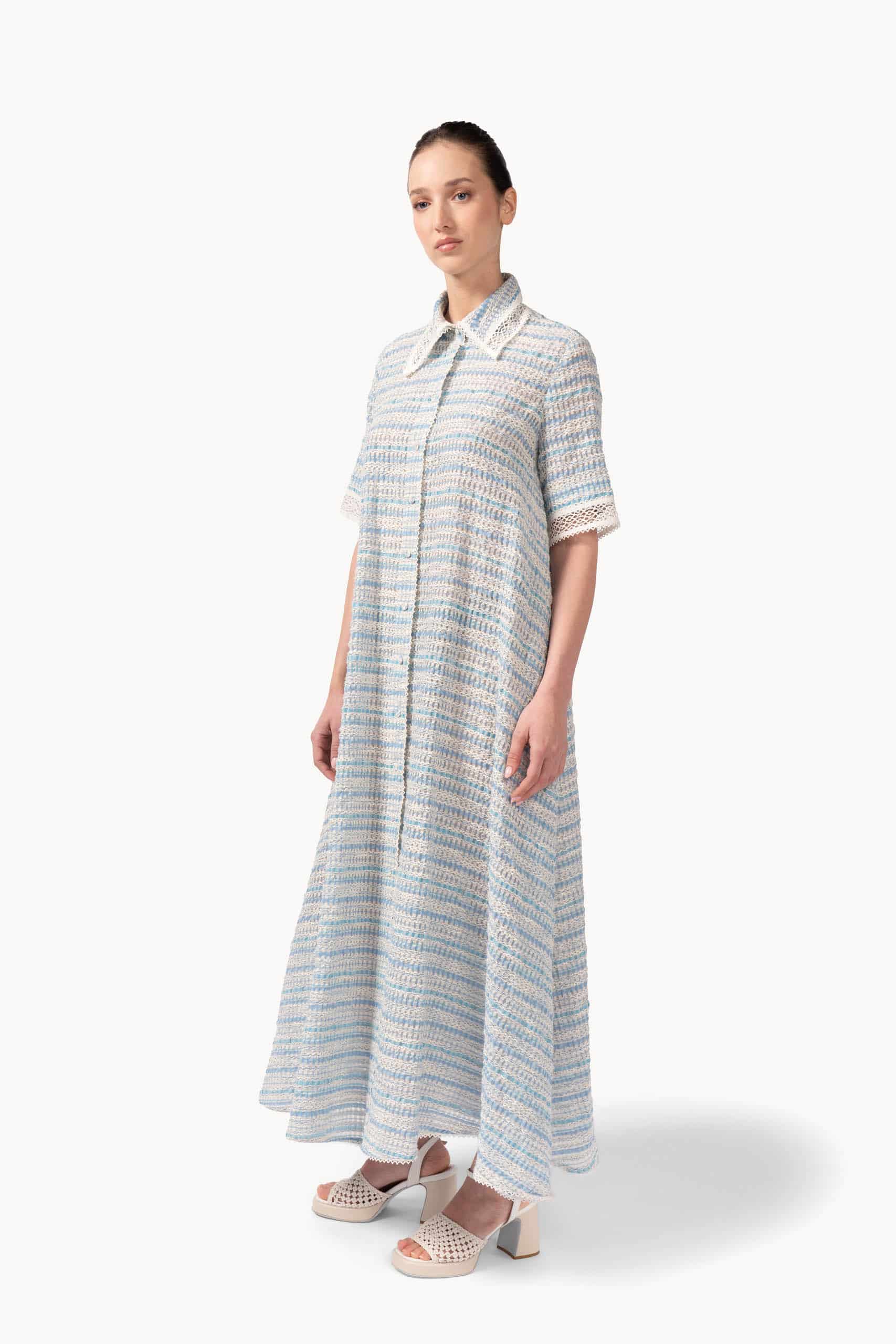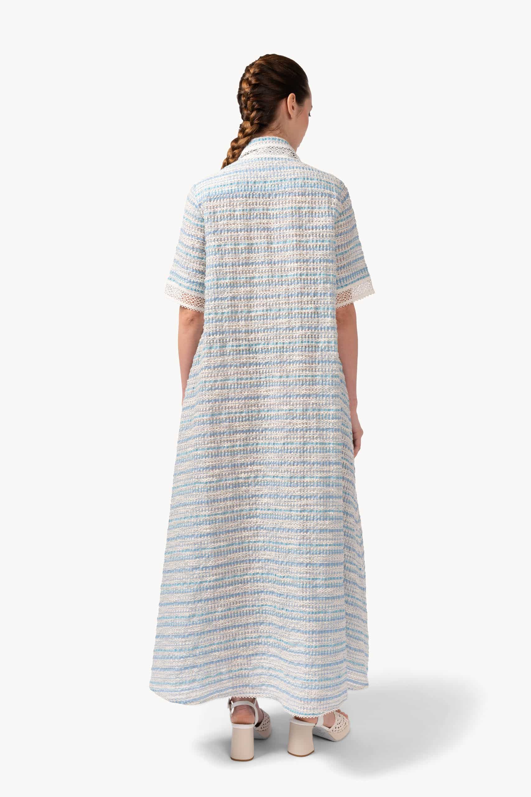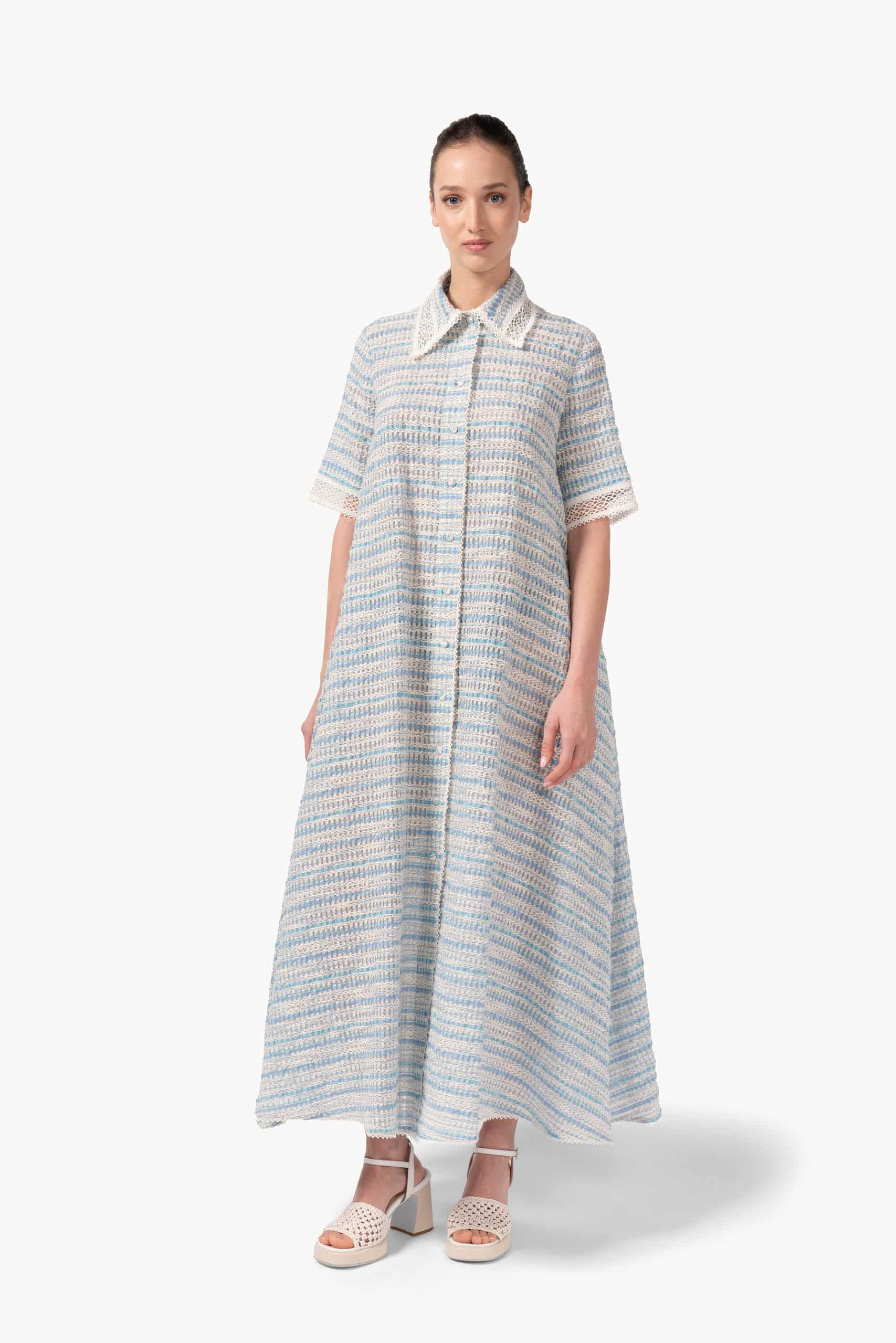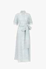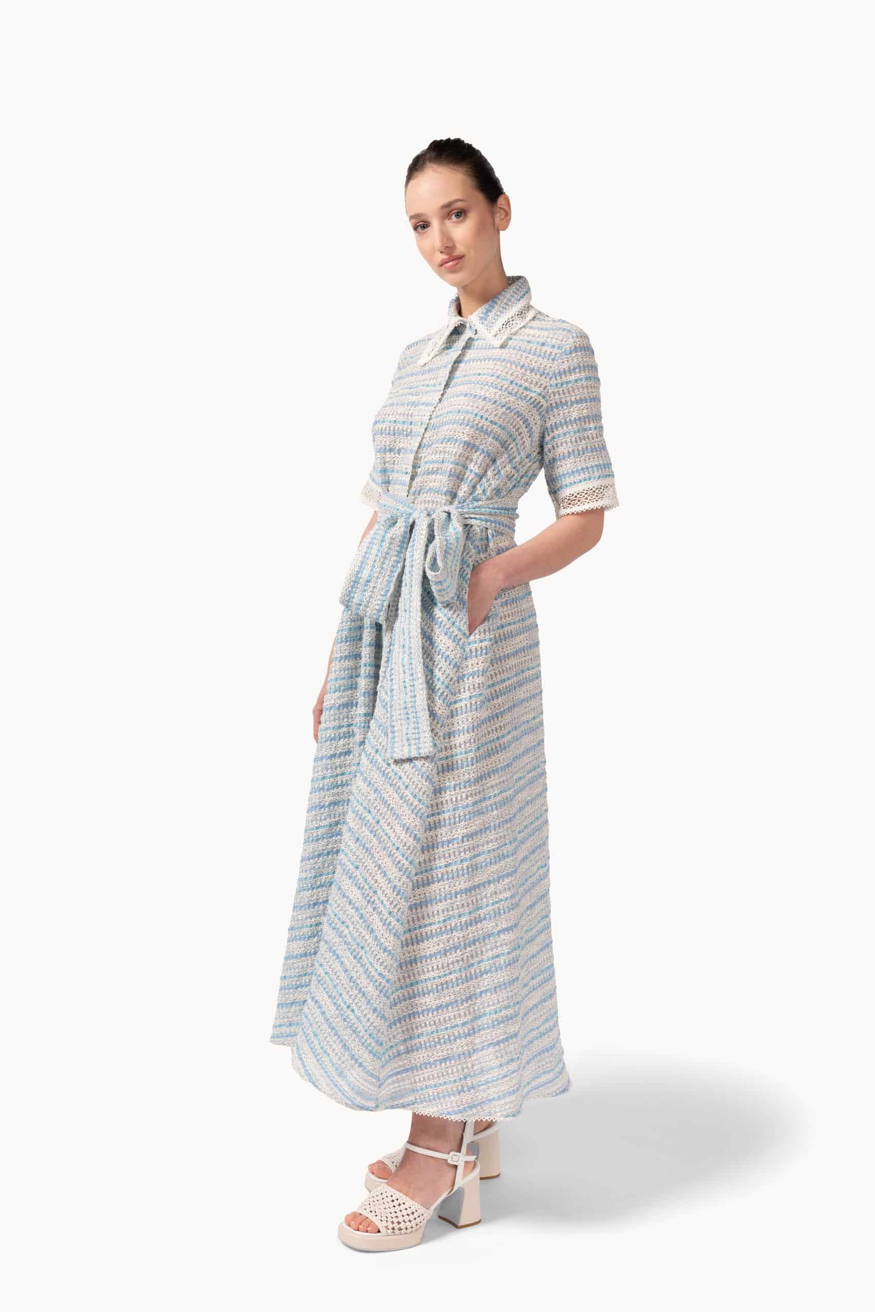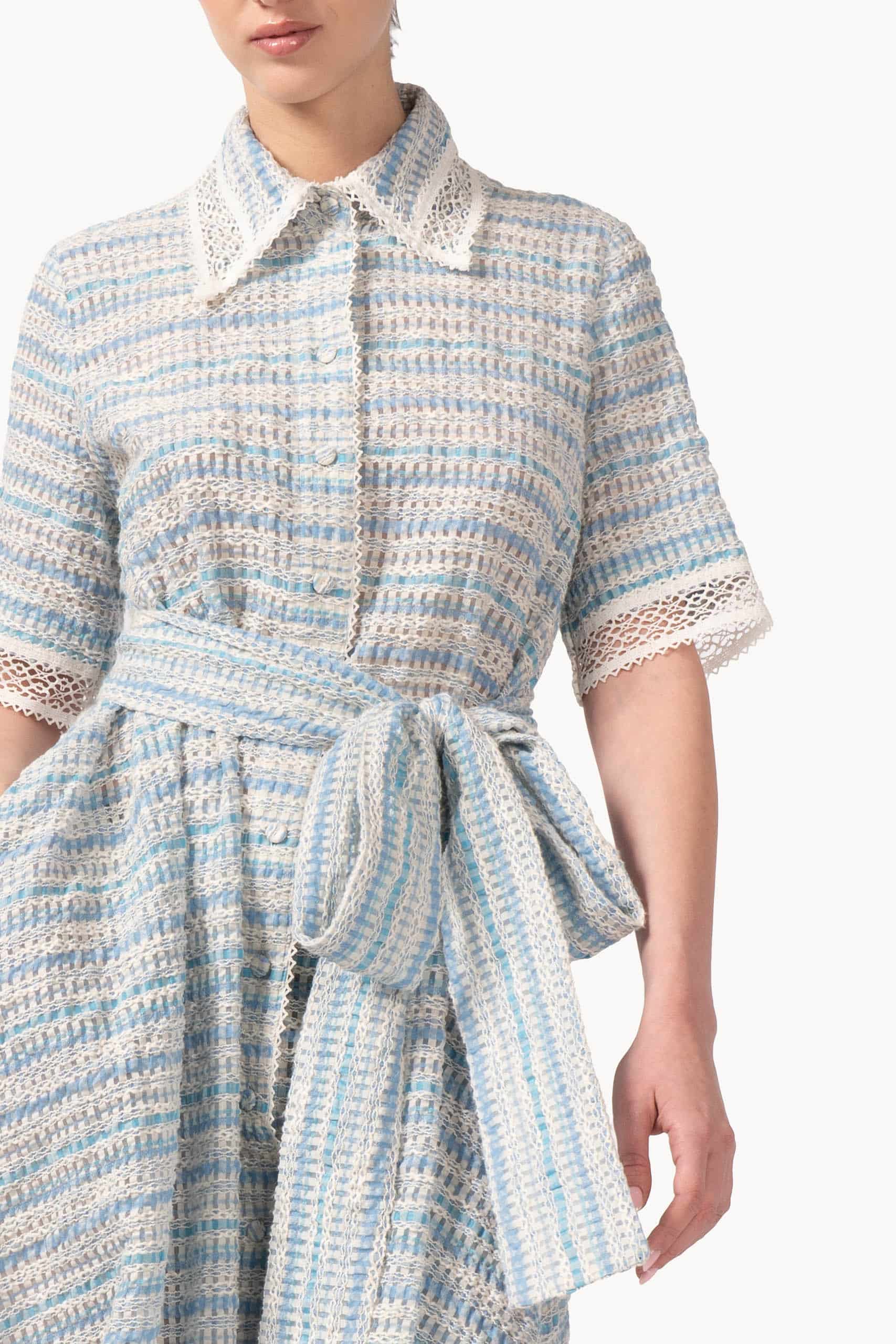 Falling to a graceful midi length, the dress moves effortlessly with each step, creating a sense of lightness and elegance. The belted waist shapes a flattering silhouette, with feminine touches throughout the design.