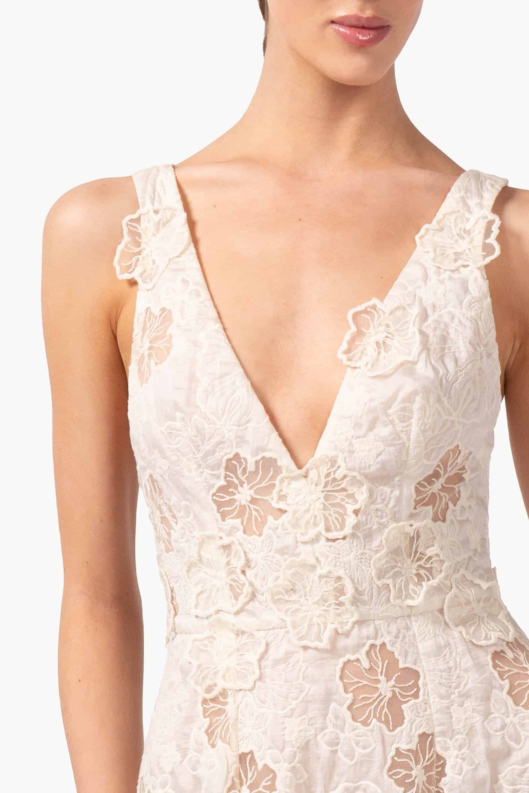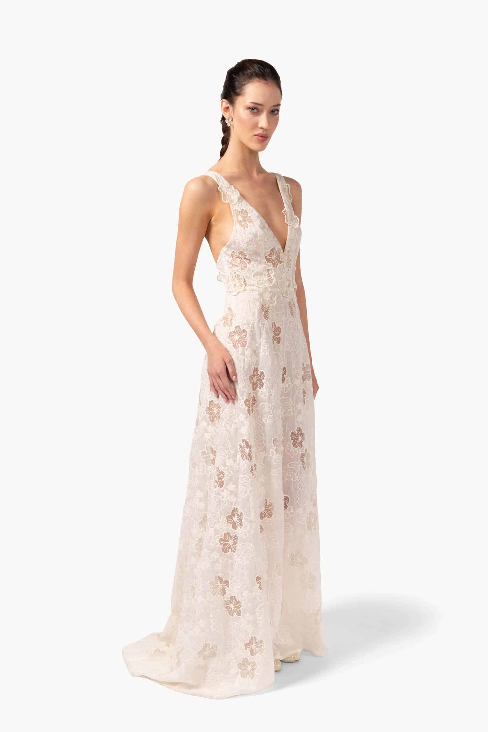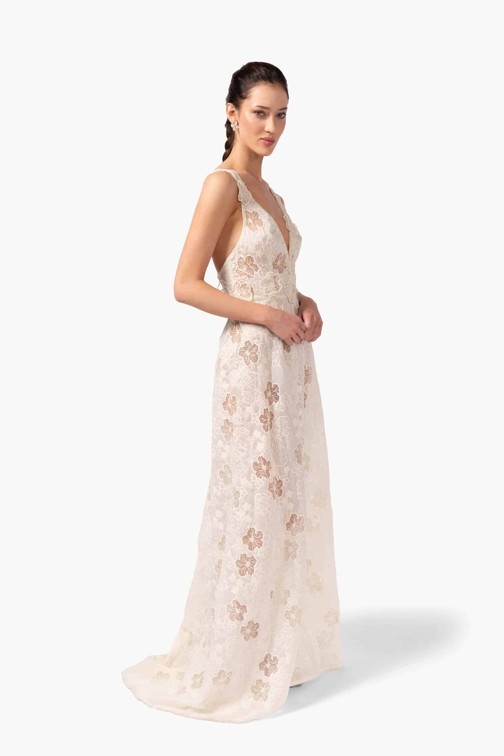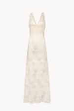 This maxi dress features a tailored bodice and a long, flowing skirt for a flattering, streamlined look. Floral jacquard inlays add texture and sophistication, while the gently shaped waist ensures a polished and versatile silhouette for a variety of occasions.