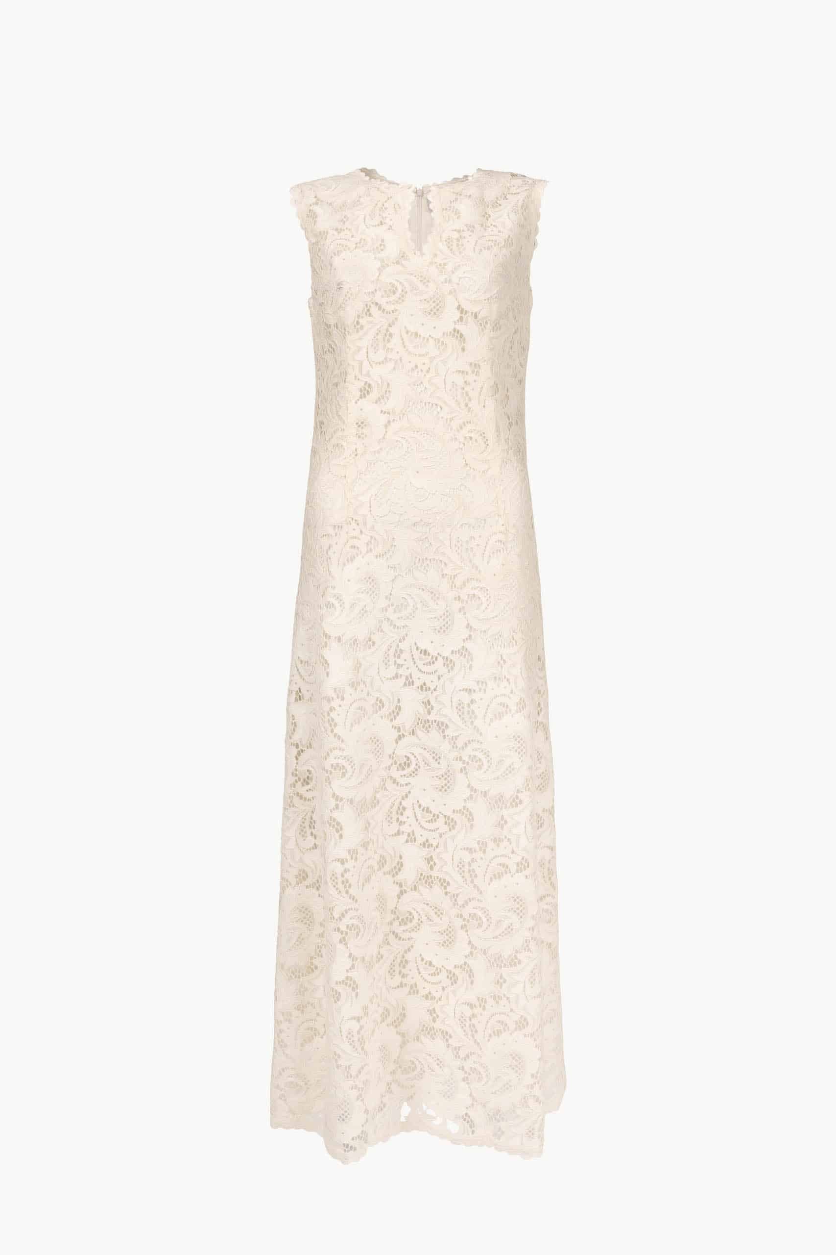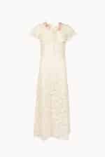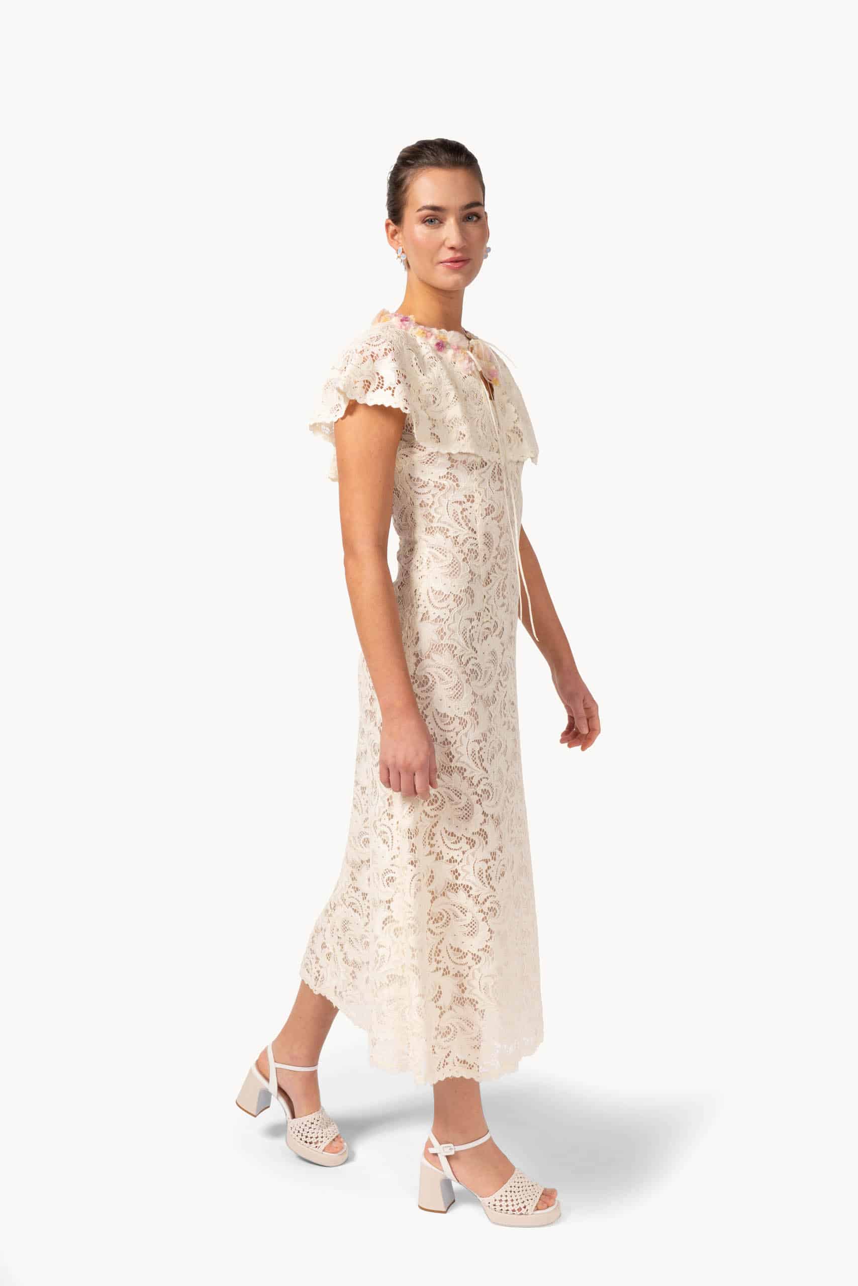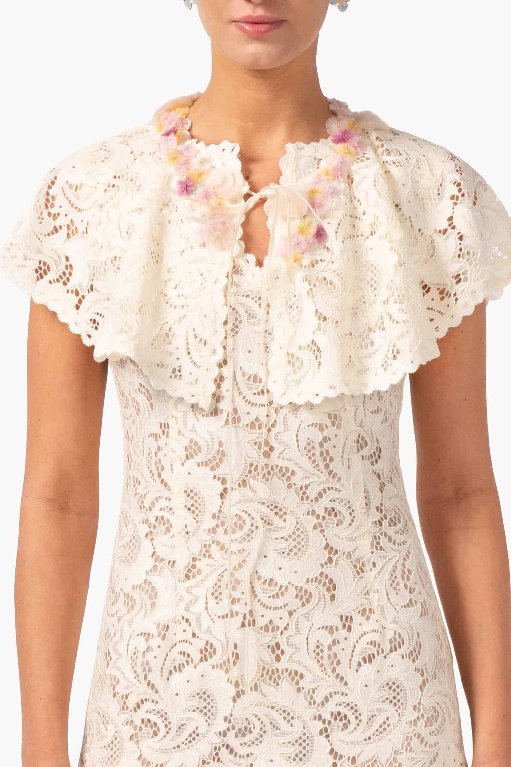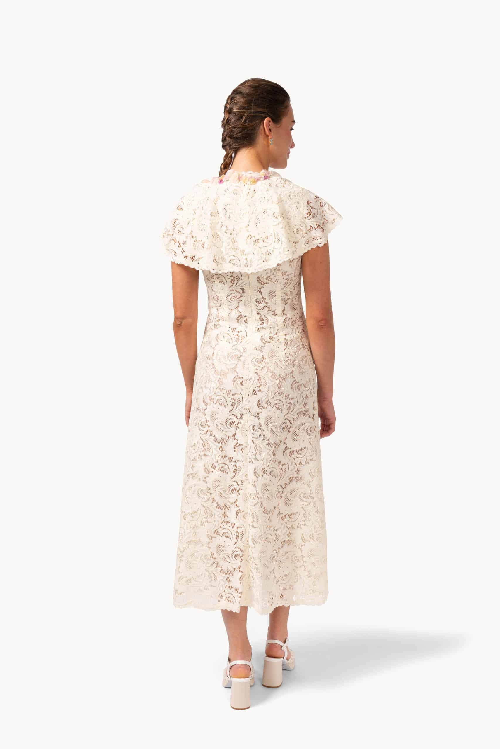 Delicate lace blooms across the A-line silhouette, while a flowing skirt drifts softly with every step. The embroidered capelet rests lightly on the shoulders, its intricate motifs adding a whisper of whimsy and refinement to the ensemble.