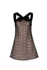 This enchanting short dress features a delicate layer of pink organza beneath intricately embroidered black tulle, creating a striking play of texture and contrast. The silhouette is finished with velvet trims that add a touch of luxury and refinement, while a subtle front crossover detail enhances the neckline with soft elegance.