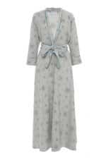 This Wrap dress is made in a cotton flannel grey eyelet and it is piped with velvet.
