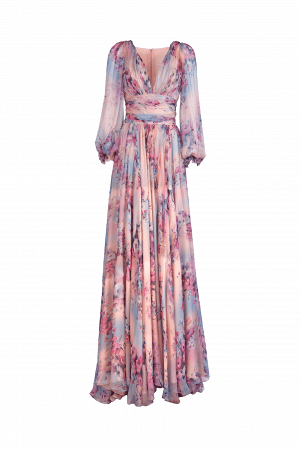 This chiffon printed gown has a V-neckline and A-line silhouette, it is draped in the bustier and waist, and has bulging long sleeves. Style it with heeled sandals and simple jewelry