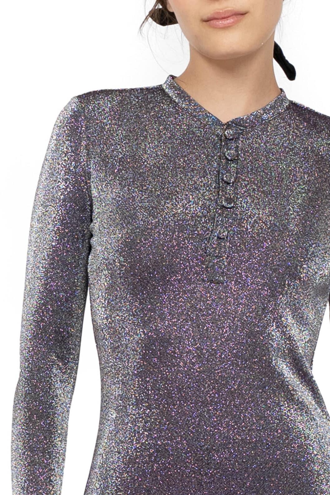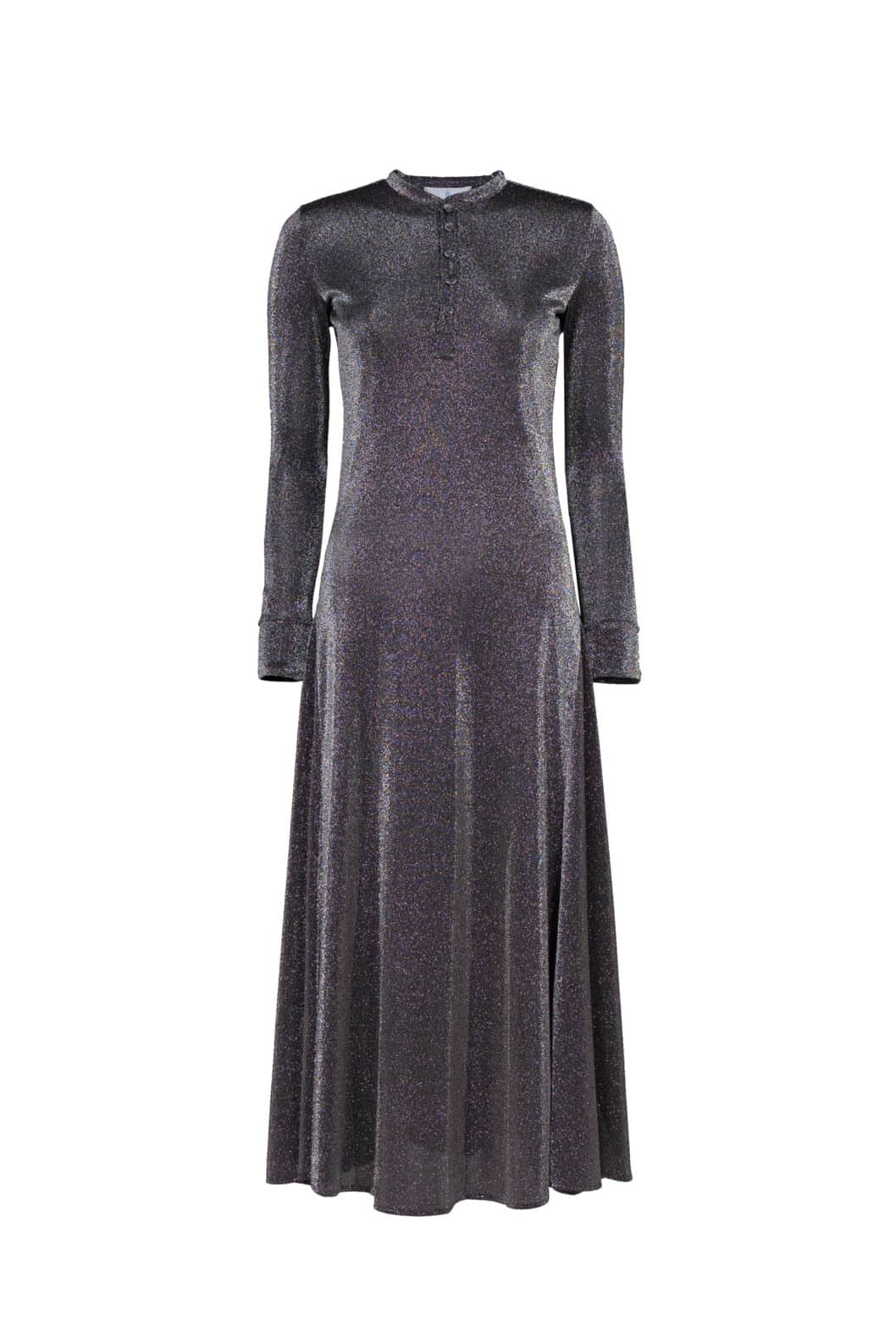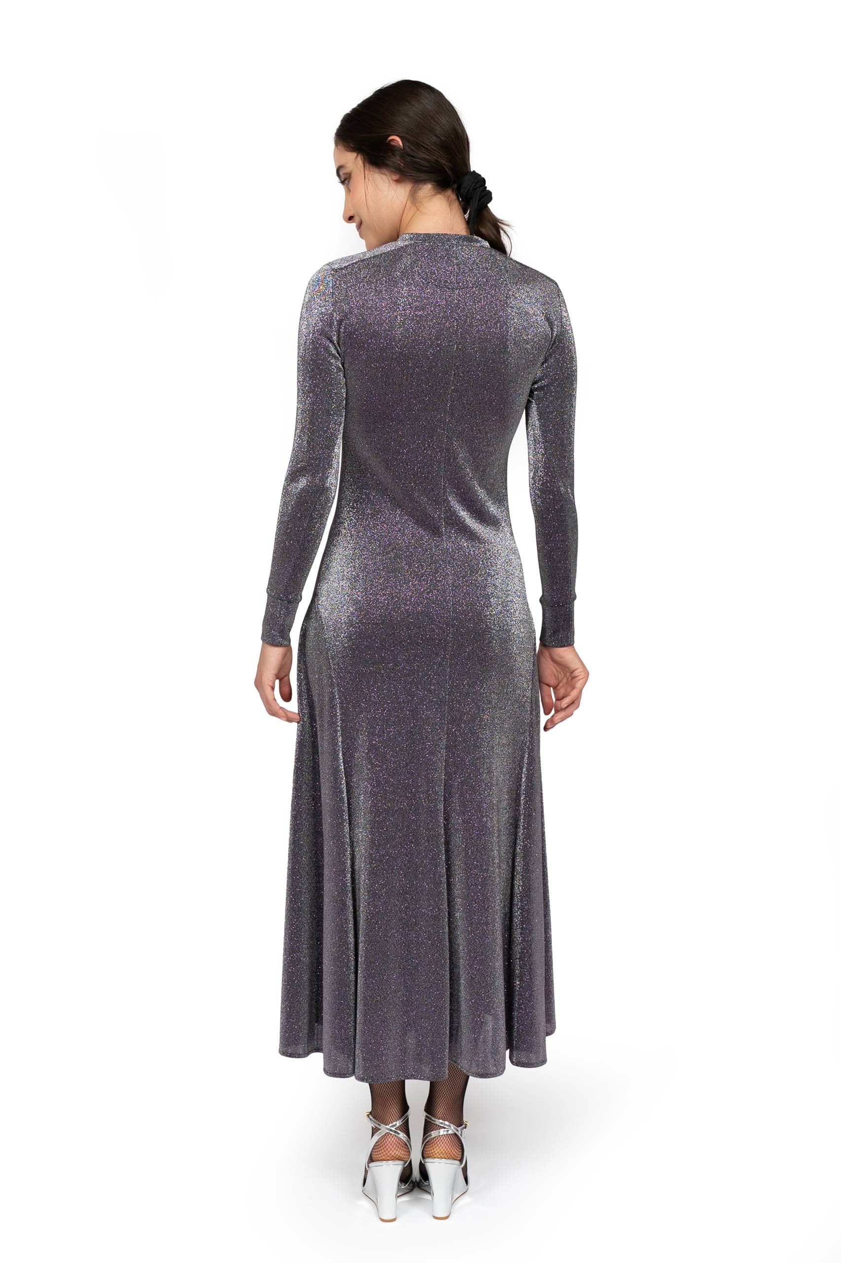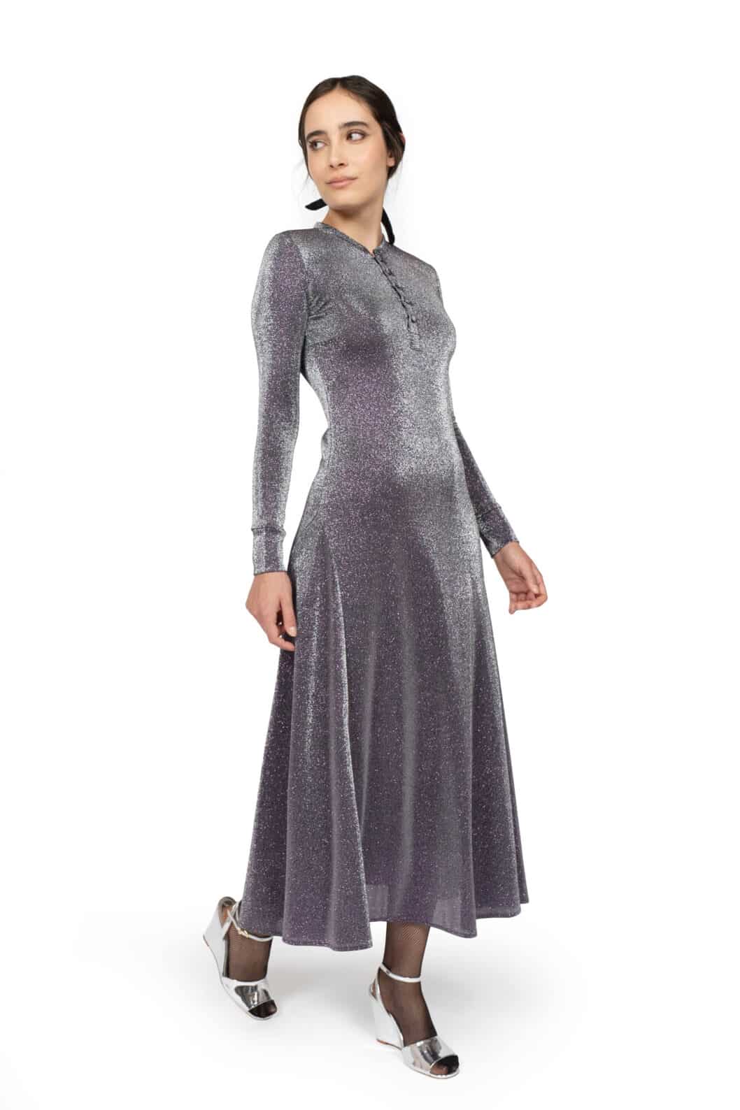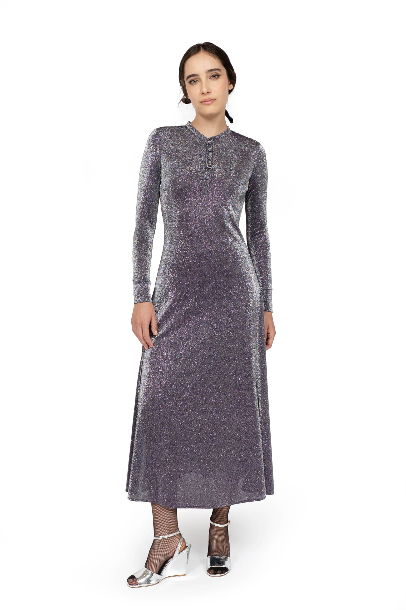 This dark purple lurex jersey dress shimmers subtly with every movement, thanks to its soft metallic finish. The flared silhouette offers fluidity and elegance, while the row of fabric-covered buttons down the front adds a refined, vintage-inspired touch. Effortlessly balancing comfort and glamour, it’s a versatile piece that transitions beautifully from day to night.