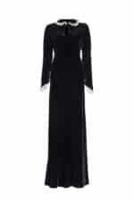 Long velvet dress featuring sleeves and a buttoned bust opening.