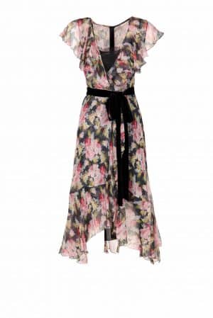 This wrap dress is made from micro poppies printed chiffon. It has flounces in the neckline and a delicate lace trimming.